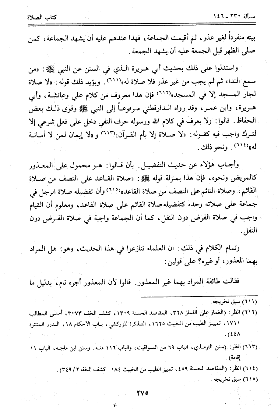 بِأَنْ قَالُوا: هُوَ مَحْمُولٌ عَلَى الْمَعْذُورِ كَالْمَرِيضِ وَنَحْوِهِ، فَإِنَّ هَذَا بِمَنْزِلَةِ قَوْلِهِ - صَلَّى اللَّهُ عَلَيْهِ وَسَلَّمَ -: «صَلَاةُ الْقَاعِدِ عَلَى النِّصْفِ مِنْ صَلَاةِ الْقَائِمِ، وَصَلَاةُ النَّائِمِ عَلَى النِّصْفِ مِنْ صَلَاةِ الْقَاعِدِ» وَأَنَّ تَفْضِيلَهُ صَلَاةَ الرَّجُلِ فِي جَمَاعَةٍ عَلَى صَلَاتِهِ وَحْدَهُ كَتَفْضِيلِهِ صَلَاةَ الْقَائِمِ عَلَى صَلَاةِ الْقَاعِدِ، وَمَعْلُومٌ أَنَّ الْقِيَامَ وَاجِبٌ فِي صَلَاةِ الْفَرْضِ دُونَ النَّفْلِ، كَمَا أَنَّ الْجَمَاعَةَ وَاجِبَةٌ فِي صَلَاةِ الْفَرْضِ دُونَ النَّفْلِ.