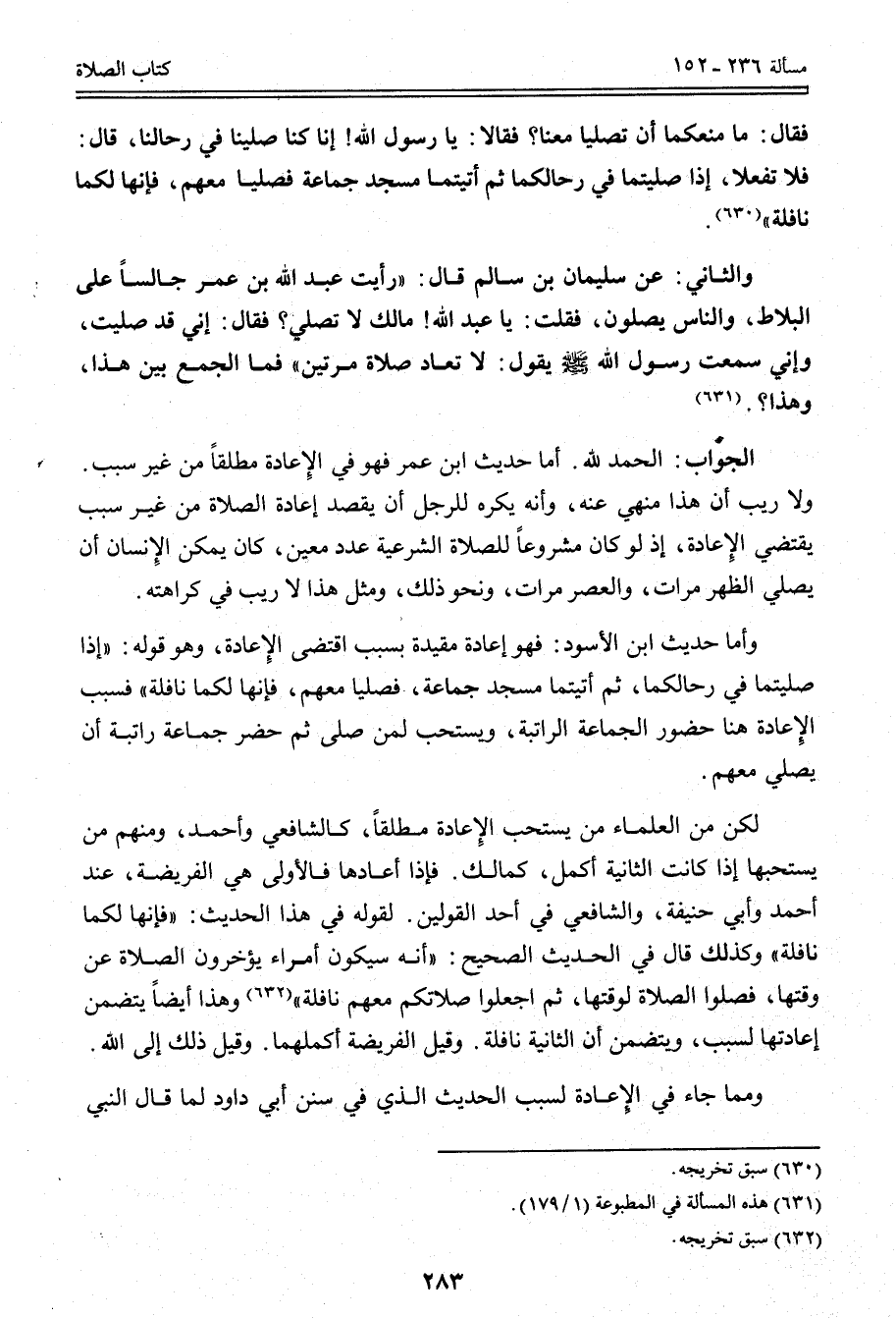 الْجَوَابُ: الْحَمْدُ لِلَّهِ. أَمَّا حَدِيثُ ابْنِ عُمَرَ فَهُوَ فِي الْإِعَادَةِ مُطْلَقًا مِنْ غَيْرِ سَبَبٍ.