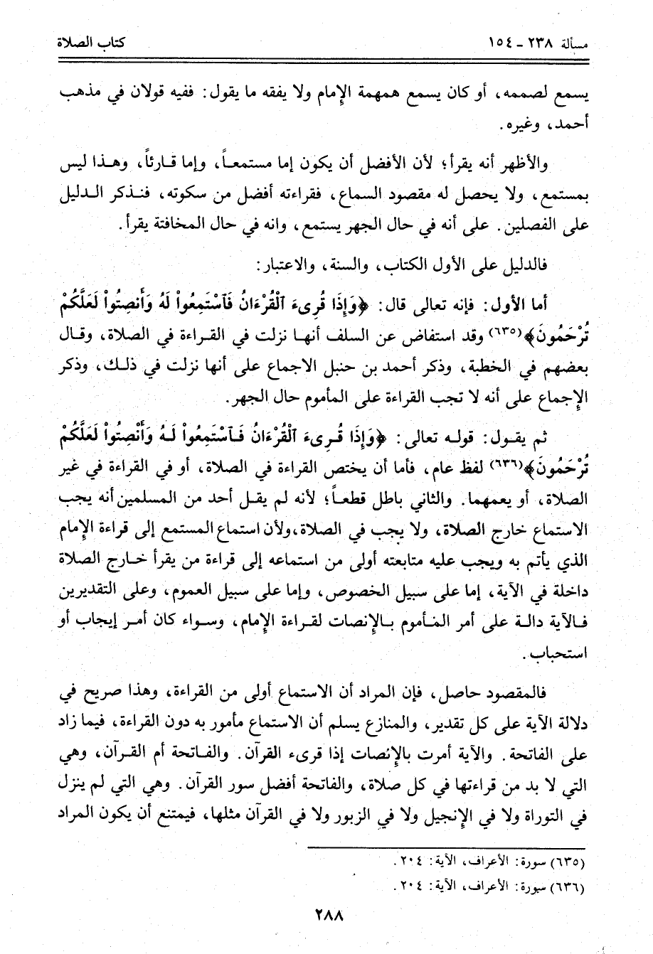 ثُمَّ يَقُولُ: قَوْله تَعَالَى: {وَإِذَا قُرِئَ الْقُرْآنُ فَاسْتَمِعُوا لَهُ وَأَنْصِتُوا لَعَلَّكُمْ تُرْحَمُونَ} [الأعراف: 204] لَفْظٌ عَامٌّ، فَإِمَّا أَنْ يَخْتَصَّ الْقِرَاءَةَ فِي الصَّلَاةِ، أَوْ فِي الْقِرَاءَةِ فِي غَيْرِ الصَّلَاةِ، أَوْ يَعُمَّهُمَا.