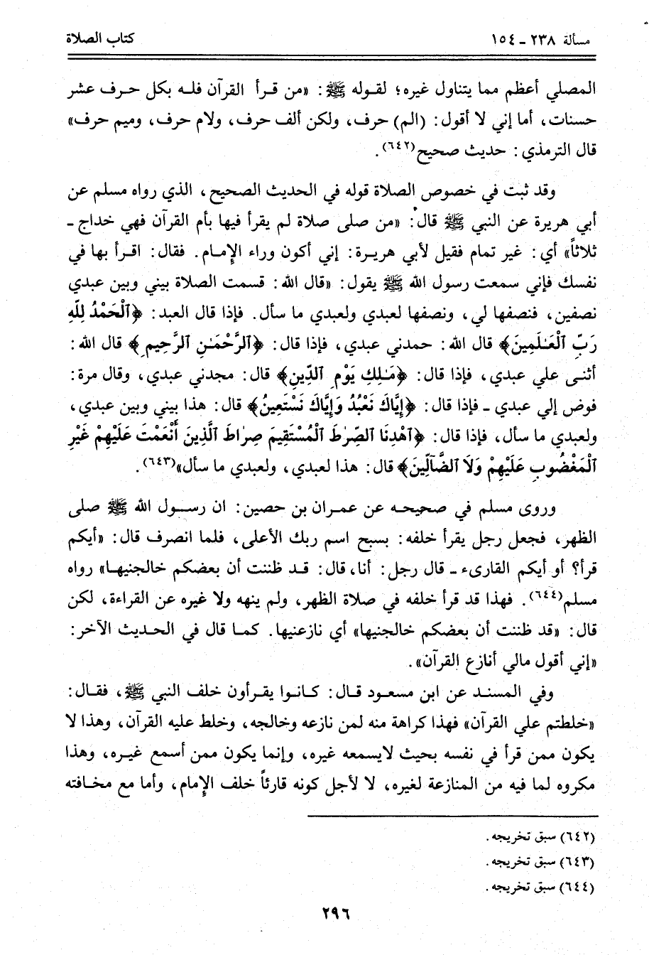 وَقَدْ ثَبَتَ فِي خُصُوصِ الصَّلَاةِ قَوْلُهُ فِي الْحَدِيثِ الصَّحِيحِ، الَّذِي رَوَاهُ مُسْلِمٌ عَنْ «أَبِي هُرَيْرَةَ عَنْ النَّبِيِّ - صَلَّى اللَّهُ عَلَيْهِ وَسَلَّمَ - قَالَ: مَنْ صَلَّى صَلَاةً لَمْ يَقْرَأْ فِيهَا بِأُمِّ الْقُرْآنِ فَهِيَ خِدَاجٌ - ثَلَاثًا أَيْ: غَيْرُ تَمَامٍ فَقِيلَ لِأَبِي هُرَيْرَةَ: إنِّي أَكُونُ وَرَاءَ الْإِمَامِ. فَقَالَ: اقْرَأْ بِهَا فِي نَفْسِك فَإِنِّي سَمِعْت رَسُولَ اللَّهِ - صَلَّى اللَّهُ عَلَيْهِ وَسَلَّمَ - يَقُولُ: قَالَ اللَّهُ: قَسَمْتُ الصَّلَاةَ بَيْنِي وَبَيْنَ عَبْدِي نِصْفَيْنِ، فَنِصْفُهَا لِي، وَنِصْفُهَا لِعَبْدِي وَلِعَبْدِي مَا سَأَلَ. فَإِذَا قَالَ الْعَبْدُ: {الْحَمْدُ لِلَّهِ رَبِّ الْعَالَمِينَ} [الفاتحة: 2] قَالَ اللَّهُ: حَمِدَنِي عَبْدِي، فَإِذَا قَالَ: {الرَّحْمَنِ الرَّحِيمِ} [الفاتحة: 3] قَالَ اللَّهُ: أَثْنَى عَلَيَّ عَبْدِي، فَإِذَا قَالَ: {مَالِكِ يَوْمِ الدِّينِ} [الفاتحة: 4] قَالَ: مَجَّدَنِي عَبْدِي، وَقَالَ مَرَّةً: فَوَّضَ إلَيَّ عَبْدِي - فَإِذَا قَالَ: {إِيَّاكَ نَعْبُدُ وَإِيَّاكَ نَسْتَعِينُ} [الفاتحة: 5] قَالَ: هَذَا بَيْنِي وَبَيْنَ عَبْدِي، وَلِعَبْدِي مَا سَأَلَ، فَإِذَا قَالَ: {اهْدِنَا الصِّرَاطَ الْمُسْتَقِيمَ} [الفاتحة: 6] {صِرَاطَ الَّذِينَ أَنْعَمْتَ عَلَيْهِمْ غَيْرِ الْمَغْضُوبِ عَلَيْهِمْ وَلا الضَّالِّينَ} [الفاتحة: 7] قَالَ: هَذَا لِعَبْدِي، وَلِعَبْدِي مَا سَأَلَ» .