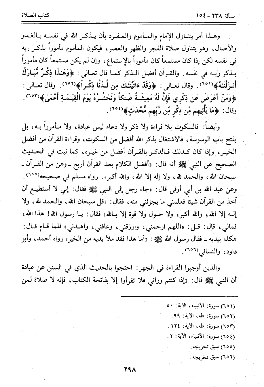 وَأَيْضًا: فَالسُّكُوتُ بِلَا قِرَاءَةٍ وَلَا ذِكْرٍ وَلَا دُعَاءٍ لَيْسَ عِبَادَةً، وَلَا مَأْمُورًا بِهِ، بَلْ يَفْتَحُ بَابَ الْوَسْوَسَةِ، فَالِاشْتِغَالُ بِذِكْرِ اللَّهِ أَفْضَلُ مِنْ السُّكُوتِ، وَقِرَاءَةُ الْقُرْآنِ مِنْ أَفْضَلِ الْخَيْرِ، وَإِذَا كَانَ كَذَلِكَ فَالذِّكْرُ بِالْقُرْآنِ أَفْضَلُ مِنْ غَيْرِهِ، كَمَا ثَبَتَ فِي الْحَدِيثِ الصَّحِيحِ عَنْ النَّبِيِّ - صَلَّى اللَّهُ عَلَيْهِ وَسَلَّمَ - أَنَّهُ قَالَ: «أَفْضَلُ الْكَلَامِ بَعْدَ الْقُرْآنِ أَرْبَعٌ - وَهُنَّ مِنْ الْقُرْآنِ - سُبْحَانَ اللَّهِ، وَالْحَمْدُ لِلَّهِ، وَلَا إلَهَ إلَّا اللَّهُ، وَاَللَّهُ أَكْبَرُ» رَوَاهُ مُسْلِمٌ فِي صَحِيحِهِ.
