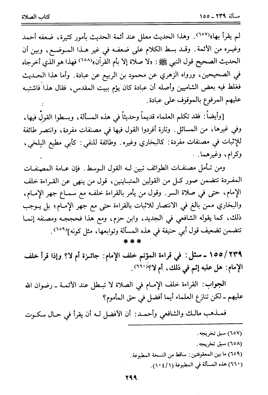 239 - 155 - سُئِلَ: فِي قِرَاءَةِ الْمُؤْتَمِّ خَلْفَ الْإِمَامِ: جَائِزَةٌ أَمْ لَا؟ وَإِذَا قَرَأَ خَلْفَ الْإِمَامِ: هَلْ عَلَيْهِ إثْمٌ فِي ذَلِكَ، أَمْ لَا؟