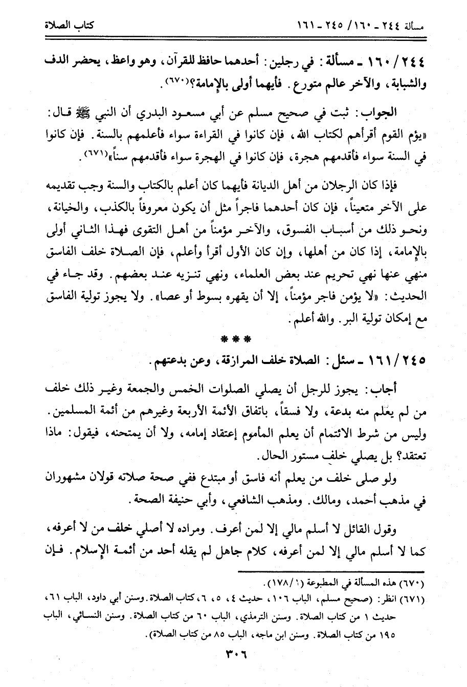 الْجَوَابُ: ثَبَتَ فِي صَحِيحِ مُسْلِمٍ عَنْ أَبِي مَسْعُودٍ الْبَدْرِيِّ أَنَّ النَّبِيَّ - صَلَّى اللَّهُ عَلَيْهِ وَسَلَّمَ - قَالَ: «يَؤُمُّ الْقَوْمَ أَقْرَأُهُمْ لِكِتَابِ اللَّهِ، فَإِنْ كَانُوا فِي الْقِرَاءَةِ سَوَاءً فَأَعْلَمُهُمْ بِالسُّنَّةِ. فَإِنْ كَانُوا فِي السُّنَّةِ سَوَاءً فَأَقْدَمُهُمْ هِجْرَةً، فَإِنْ كَانُوا فِي الْهِجْرَةِ سَوَاءً فَأَقْدَمُهُمْ سِنًّا» .