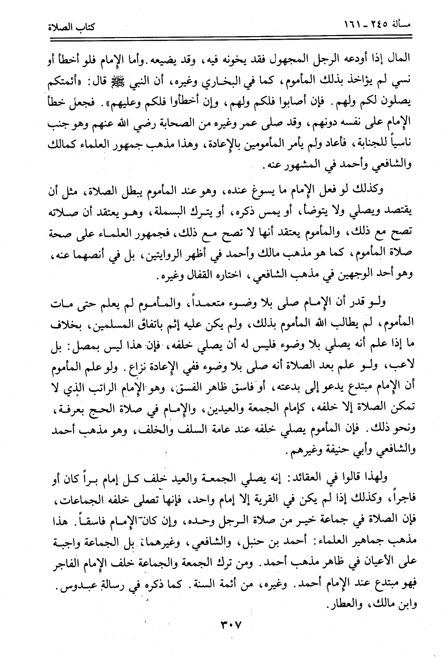 وَلِهَذَا قَالُوا فِي الْعَقَائِدِ: إنَّهُ يُصَلِّي الْجُمُعَةَ وَالْعِيدَ خَلْفَ كُلِّ إمَامٍ بَرًّا كَانَ أَوْ فَاجِرًا، وَكَذَلِكَ إذَا لَمْ يَكُنْ فِي الْقَرْيَةِ إلَّا إمَامٌ وَاحِدٌ، فَإِنَّهَا تُصَلِّي خَلْفَهُ الْجَمَاعَاتُ، فَإِنَّ الصَّلَاةَ فِي جَمَاعَةٍ خَيْرٌ مِنْ صَلَاةِ الرَّجُلِ وَحْدَهُ، وَإِنْ كَانَ الْإِمَامُ فَاسِقًا. هَذَا مَذْهَبُ جَمَاهِيرِ الْعُلَمَاءِ: أَحْمَدَ بْنِ حَنْبَلٍ، وَالشَّافِعِيِّ، وَغَيْرِهِمَا، بَلْ الْجَمَاعَةُ وَاجِبَةٌ عَلَى الْأَعْيَانِ فِي ظَاهِرِ مَذْهَبِ أَحْمَدَ.