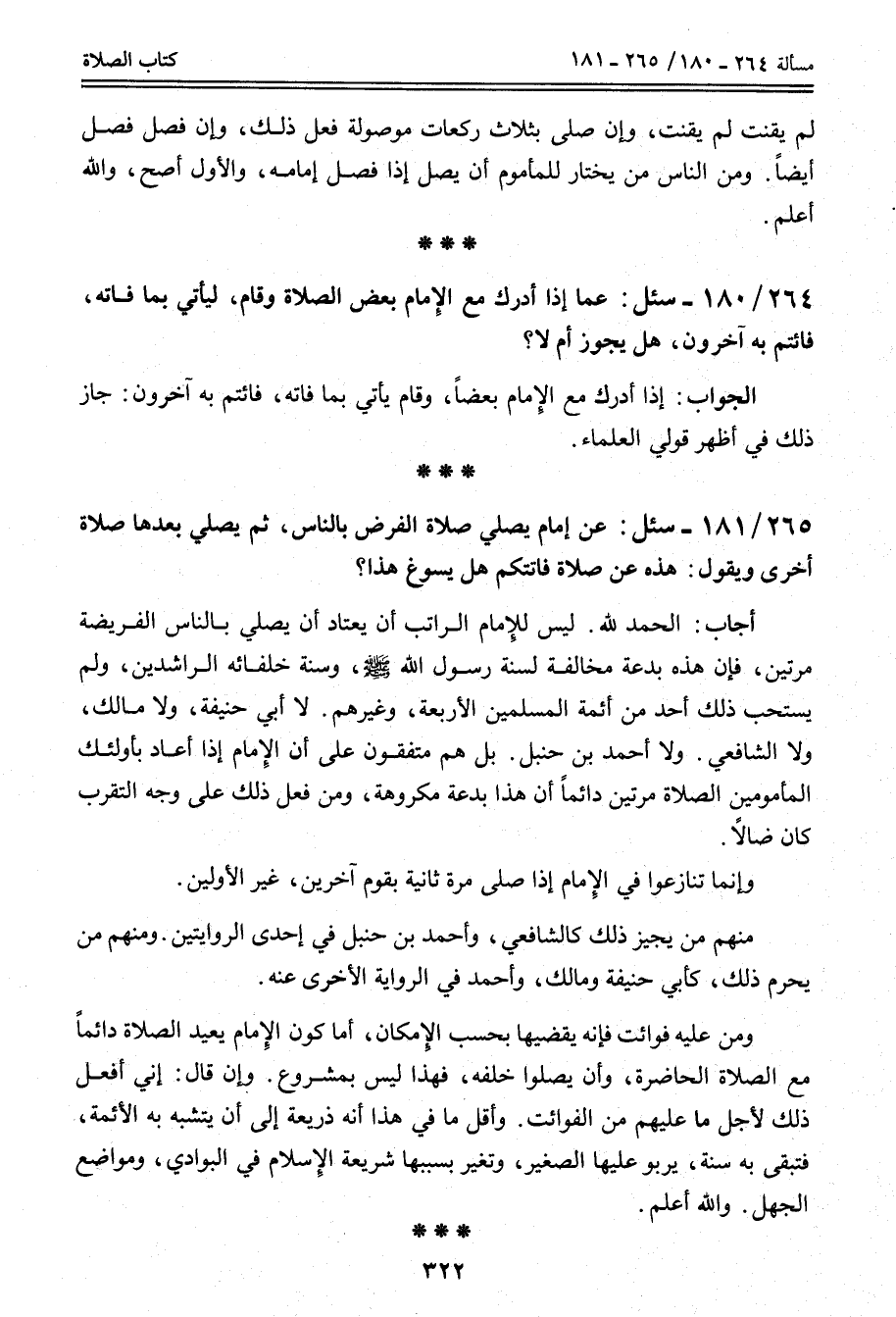 265 - 181 - سُئِلَ: عَنْ إمَامٍ يُصَلِّي صَلَاةَ الْفَرْضِ بِالنَّاسِ، ثُمَّ يُصَلِّي بَعْدَهَا صَلَاةً أُخْرَى وَيَقُولُ: هَذِهِ عَنْ صَلَاةٍ فَاتَتْكُمْ هَلْ يُسَوَّغُ هَذَا؟