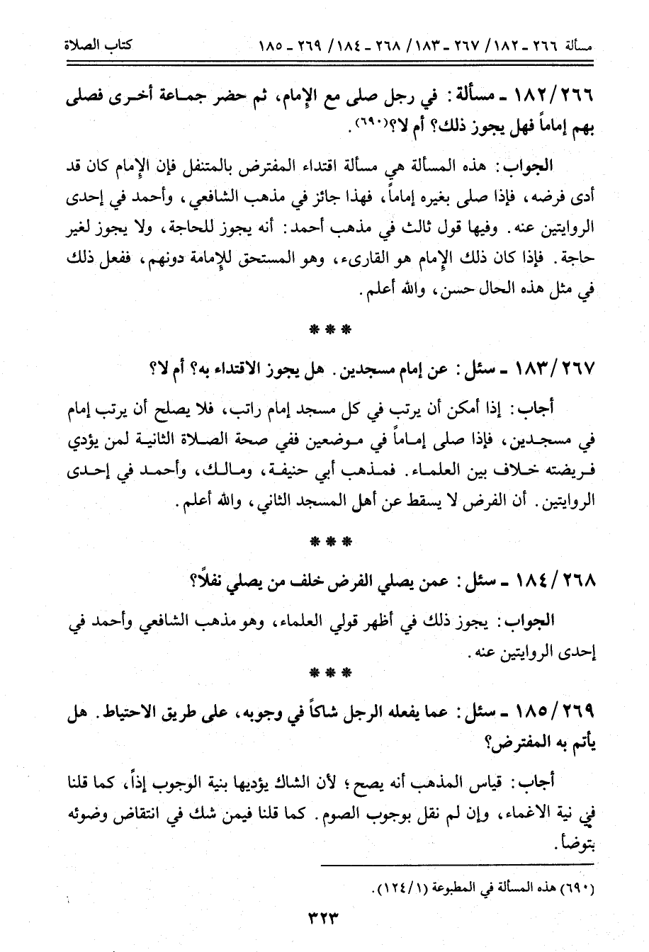268 - 184 - سُئِلَ: عَمَّنْ يُصَلِّي الْفَرْضَ خَلْفَ مَنْ يُصَلِّي نَفْلًا؟