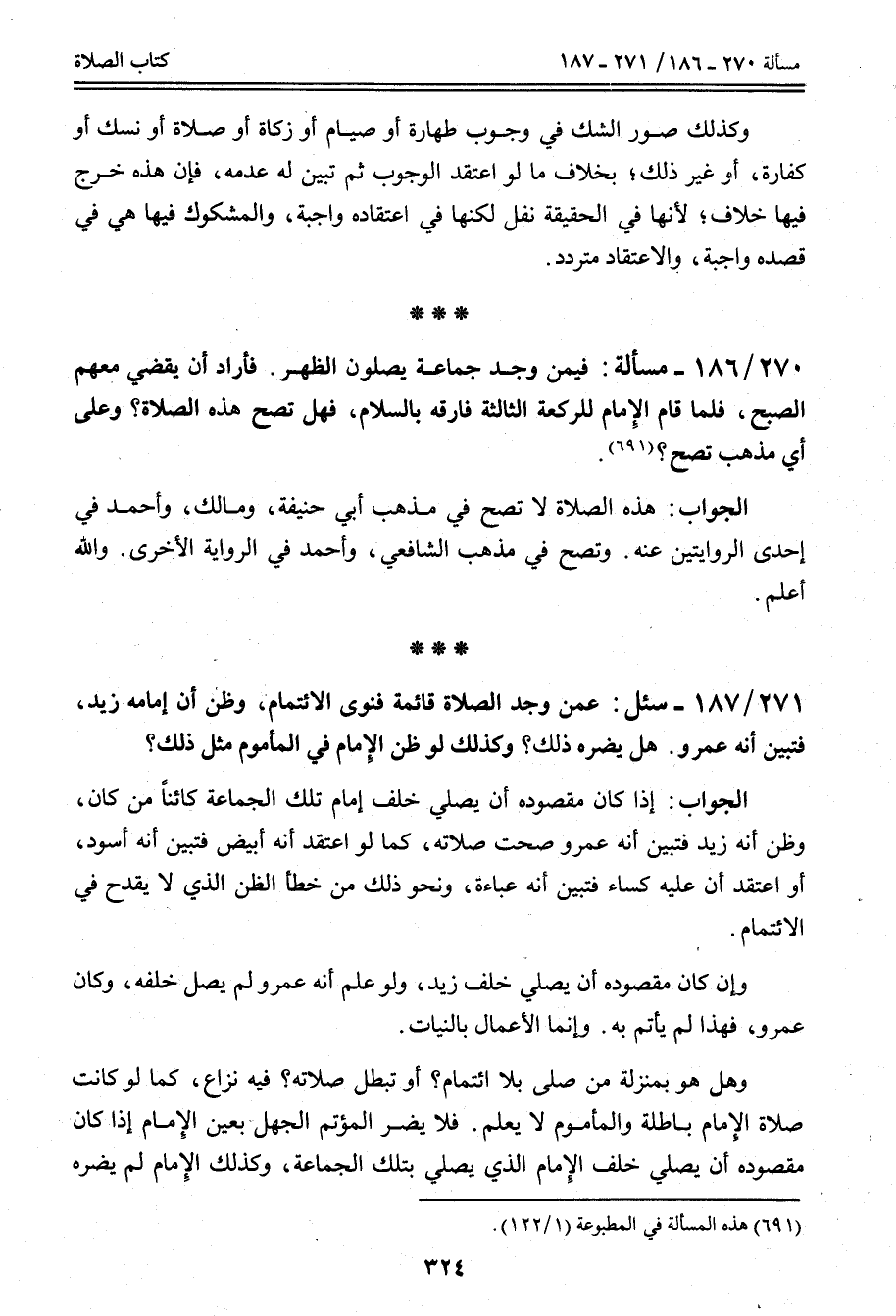 271 - 187 - سُئِلَ: عَمَّنْ وَجَدَ الصَّلَاةَ قَائِمَةً فَنَوَى الِائْتِمَامَ، وَظَنَّ أَنَّ إمَامَهُ زَيْدٌ، فَتَبَيَّنَ أَنَّهُ عَمْرٌو. هَلْ يَضُرُّهُ ذَلِكَ؟ وَكَذَلِكَ لَوْ ظَنَّ الْإِمَامُ فِي الْمَأْمُومِ مِثْلَ ذَلِكَ؟