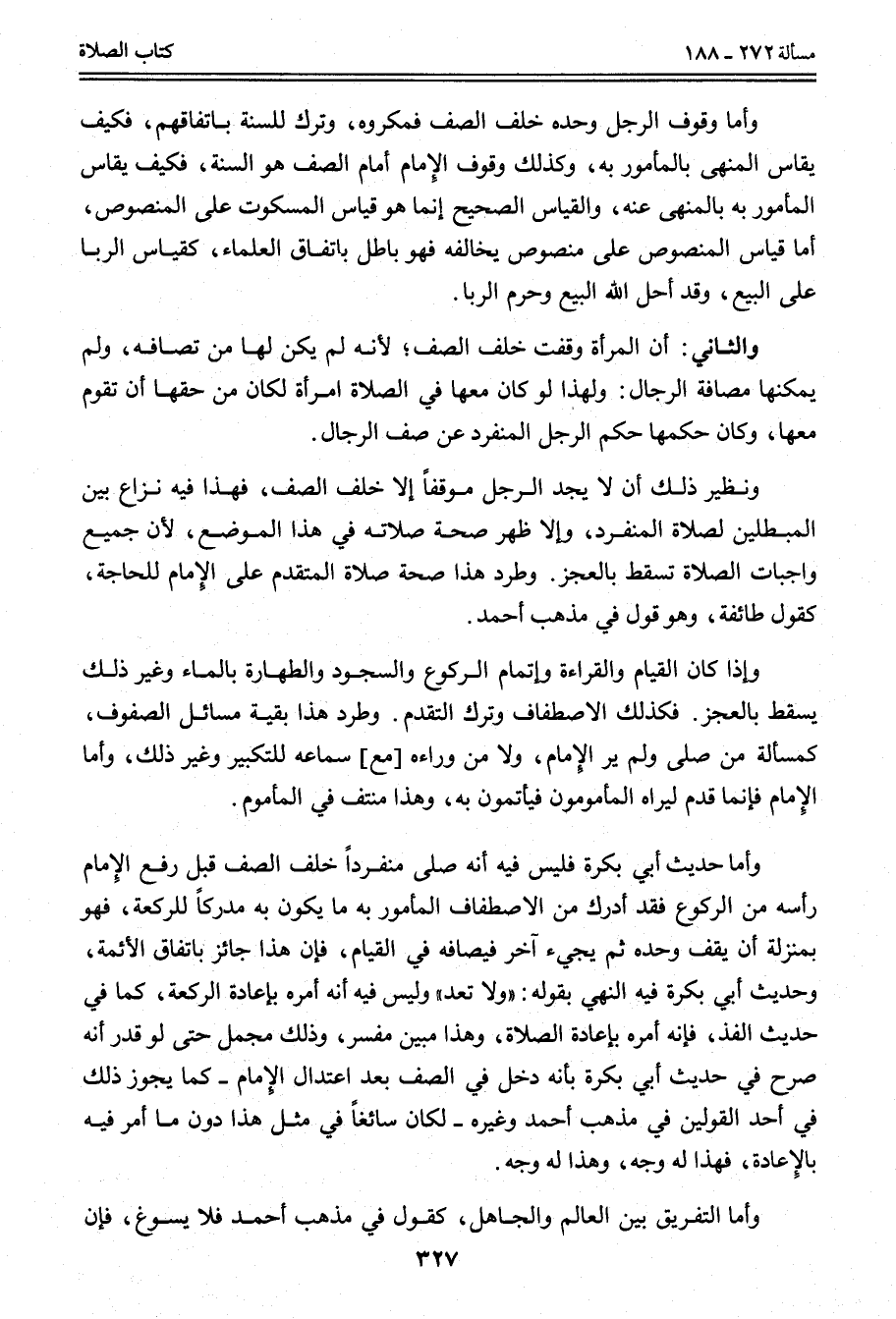وَأَمَّا وُقُوفُ الرَّجُلِ وَحْدَهُ خَلْفَ الصَّفِّ فَمَكْرُوهٌ، وَتَرْكٌ لِلسُّنَّةِ بِاتِّفَاقِهِمْ، فَكَيْفَ يُقَاسُ الْمَنْهِيُّ بِالْمَأْمُورِ بِهِ، وَكَذَلِكَ وُقُوفُ الْإِمَامِ أَمَامَ الصَّفِّ هُوَ السُّنَّةُ، فَكَيْفَ يُقَاسُ الْمَأْمُورُ بِهِ بِالْمَنْهِيِّ عَنْهُ، وَالْقِيَاسُ الصَّحِيحُ إنَّمَا هُوَ قِيَاسُ الْمَسْكُوتِ عَلَى الْمَنْصُوصِ، أَمَّا قِيَاسُ الْمَنْصُوصِ عَلَى مَنْصُوصٍ يُخَالِفُهُ فَهُوَ بَاطِلٌ بِاتِّفَاقِ الْعُلَمَاءِ، كَقِيَاسِ الرِّبَا عَلَى الْبَيْعِ وَقَدْ أَحَلَّ اللَّهُ الْبَيْعَ وَحَرَّمَ الرِّبَا.