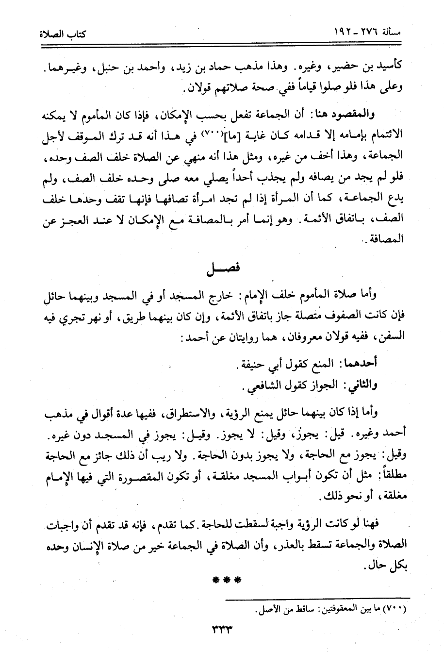 فَصْلٌ وَأَمَّا صَلَاةُ الْمَأْمُومِ خَلْفَ الْإِمَامِ: خَارِجَ الْمَسْجِدِ أَوْ فِي الْمَسْجِدِ وَبَيْنَهُمَا حَائِلٌ فَإِنْ كَانَتْ الصُّفُوفُ مُتَّصِلَةً جَازَ بِاتِّفَاقِ الْأَئِمَّةِ، وَإِنْ كَانَ بَيْنَهُمَا طَرِيقٌ، أَوْ نَهْرٌ تَجْرِي فِيهِ السُّفُنُ فَفِيهِ قَوْلَانِ مَعْرُوفَانِ، هُمَا رِوَايَتَانِ عَنْ أَحْمَدَ: أَحَدُهُمَا: الْمَنْعُ كَقَوْلِ أَبِي حَنِيفَةَ.