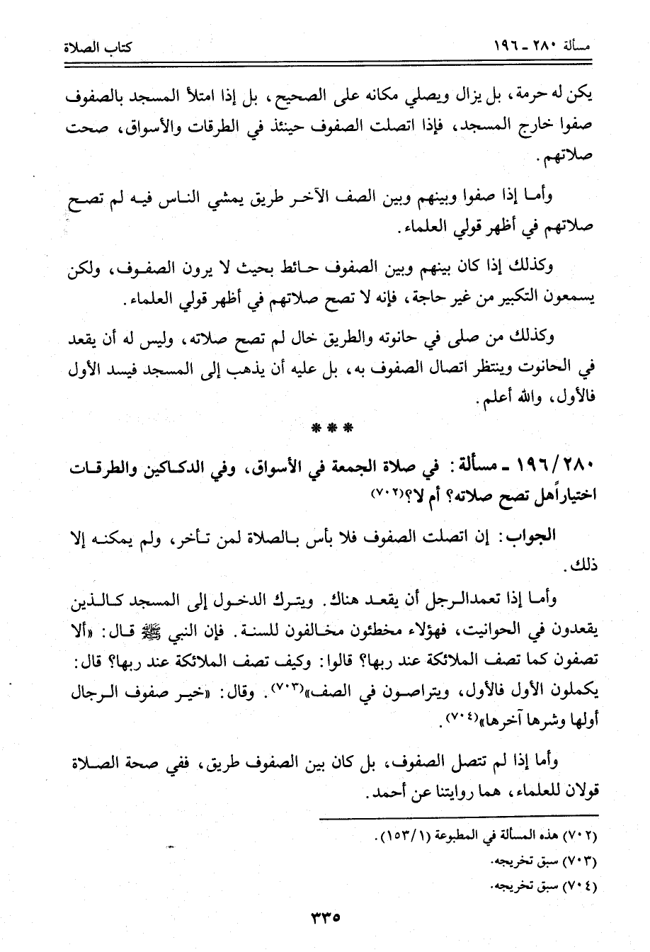 280 - 196 - مَسْأَلَةٌ: فِي صَلَاةِ الْجُمُعَةِ فِي الْأَسْوَاقِ، وَفِي الدَّكَاكِينِ وَالطُّرُقَاتِ اخْتِيَارًا هَلْ تَصِحُّ صَلَاتُهُ؟ أَمْ لَا؟