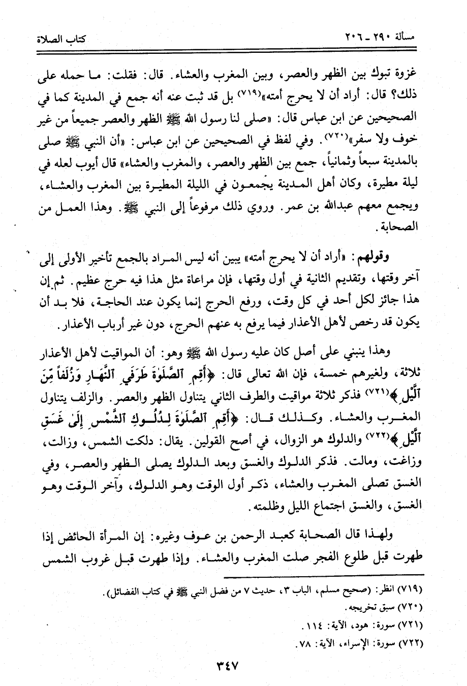غَزْوَةِ تَبُوكَ بَيْنَ الظُّهْرِ وَالْعَصْرِ، وَبَيْنَ الْمَغْرِبِ وَالْعِشَاءِ. قَالَ: فَقُلْت: مَا حَمَلَهُ عَلَى ذَلِكَ؟ قَالَ: أَرَادَ أَنْ لَا يُحْرِجَ أُمَّتَهُ» بَلْ قَدْ ثَبَتَ عَنْهُ أَنَّهُ جَمَعَ فِي الْمَدِينَةِ كَمَا فِي الصَّحِيحَيْنِ عَنْ ابْنِ عَبَّاسٍ قَالَ: «صَلَّى بِنَا رَسُولُ اللَّهِ - صَلَّى اللَّهُ عَلَيْهِ وَسَلَّمَ - الظُّهْرَ وَالْعَصْرَ جَمْعًا مِنْ غَيْرِ خَوْفٍ وَلَا سَفَرٍ. وَفِي لَفْظٍ فِي الصَّحِيحَيْنِ عَنْ ابْنِ عَبَّاسٍ: أَنَّ النَّبِيَّ - صَلَّى اللَّهُ عَلَيْهِ وَسَلَّمَ - صَلَّى بِالْمَدِينَةِ سَبْعًا وَثَمَانِيًا، جَمَعَ بَيْنَ الظُّهْرِ وَالْعَصْرِ، وَالْمَغْرِبِ وَالْعِشَاءِ»