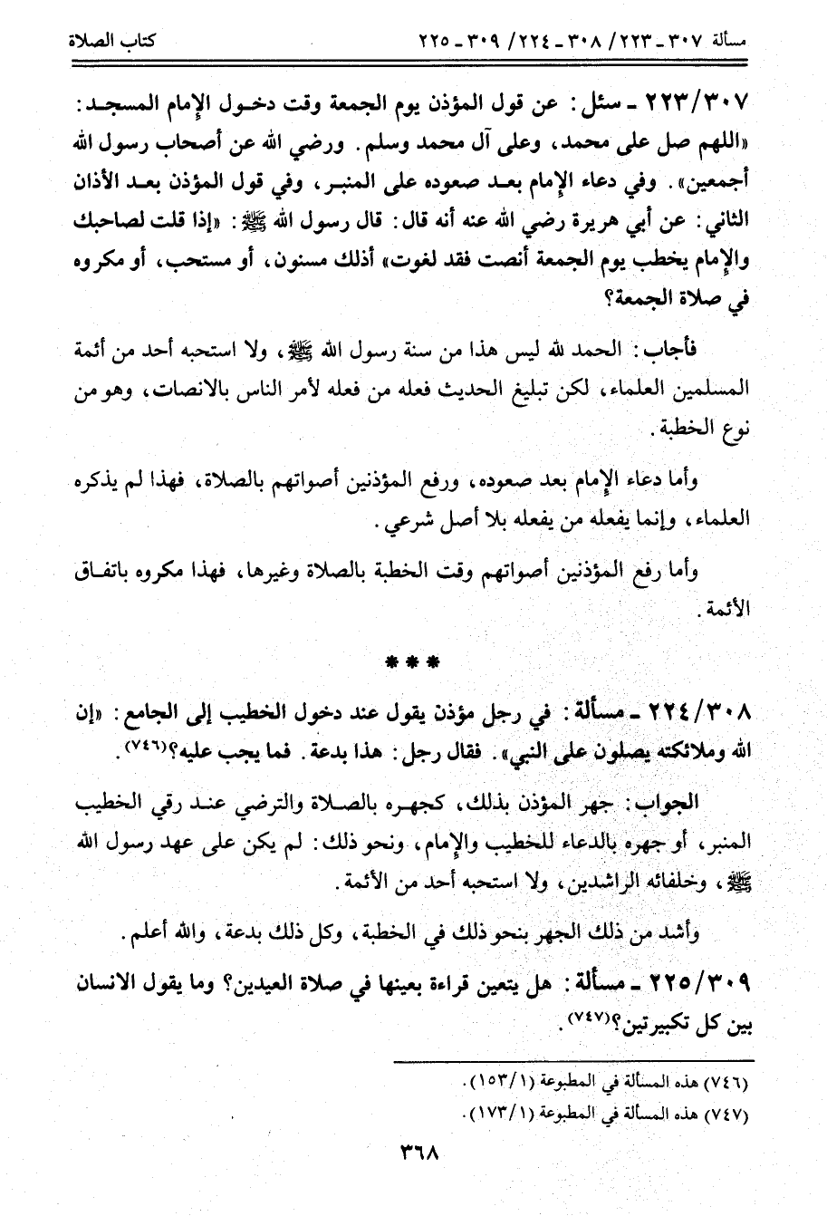 الْجَوَابُ: جَهْرُ الْمُؤَذِّنِ بِذَلِكَ، كَجَهْرِهِ بِالصَّلَاةِ وَالتَّرَضِّي عِنْدَ رُقِيِّ الْخَطِيبِ الْمِنْبَرَ، أَوْ جَهْرِهِ بِالدُّعَاءِ لِلْخَطِيبِ وَالْإِمَامِ، وَنَحْوِ ذَلِكَ: لَمْ يَكُنْ عَلَى عَهْدِ رَسُولِ اللَّهِ - صَلَّى اللَّهُ عَلَيْهِ وَسَلَّمَ - وَخُلَفَائِهِ الرَّاشِدِينَ، وَلَا اسْتَحَبَّهُ أَحَدٌ مِنْ الْأَئِمَّةِ.