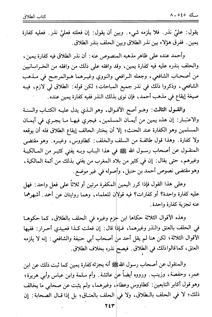 وَأَحْمَدَ عِنْدَهُ عَلَى ظَاهِرِ مَذْهَبِهِ الْمَنْصُوصِ عَنْهُ: أَنَّ نَذْرَ الطَّلَاقِ فِيهِ كَفَّارَةُ يَمِينٍ، وَالْحَلِفُ بِنَذْرِهِ عَلَيْهِ فِيهِ كَفَّارَةُ يَمِينٍ، وَقَدْ وَافَقَهُ عَلَى ذَلِكَ مَنْ وَافَقَهُ مِنْ الْخُرَاسَانِيِّينَ مِنْ أَصْحَابِ الشَّافِعِيِّ، وَجَعَلَهُ الرَّافِعِيُّ وَالنَّوَوِيُّ وَغَيْرُهُمَا هُوَ الْمُرَجَّحُ فِي مَذْهَبِ الشَّافِعِيِّ، وَذَكَرُوا ذَلِكَ فِي نَذْرِ جَمِيعِ الْمُبَاحَاتِ؛ لَكِنَّ قَوْلَهُ: الطَّلَاقُ لِي لَازِمٌ، فِيهِ صِيغَةُ إيقَاعٍ فِي مَذْهَبِ أَحْمَدَ، فَإِنْ نَوَى بِذَلِكَ النَّذْرَ فَفِيهِ كَفَّارَةُ يَمِينٍ عِنْدَهُ.