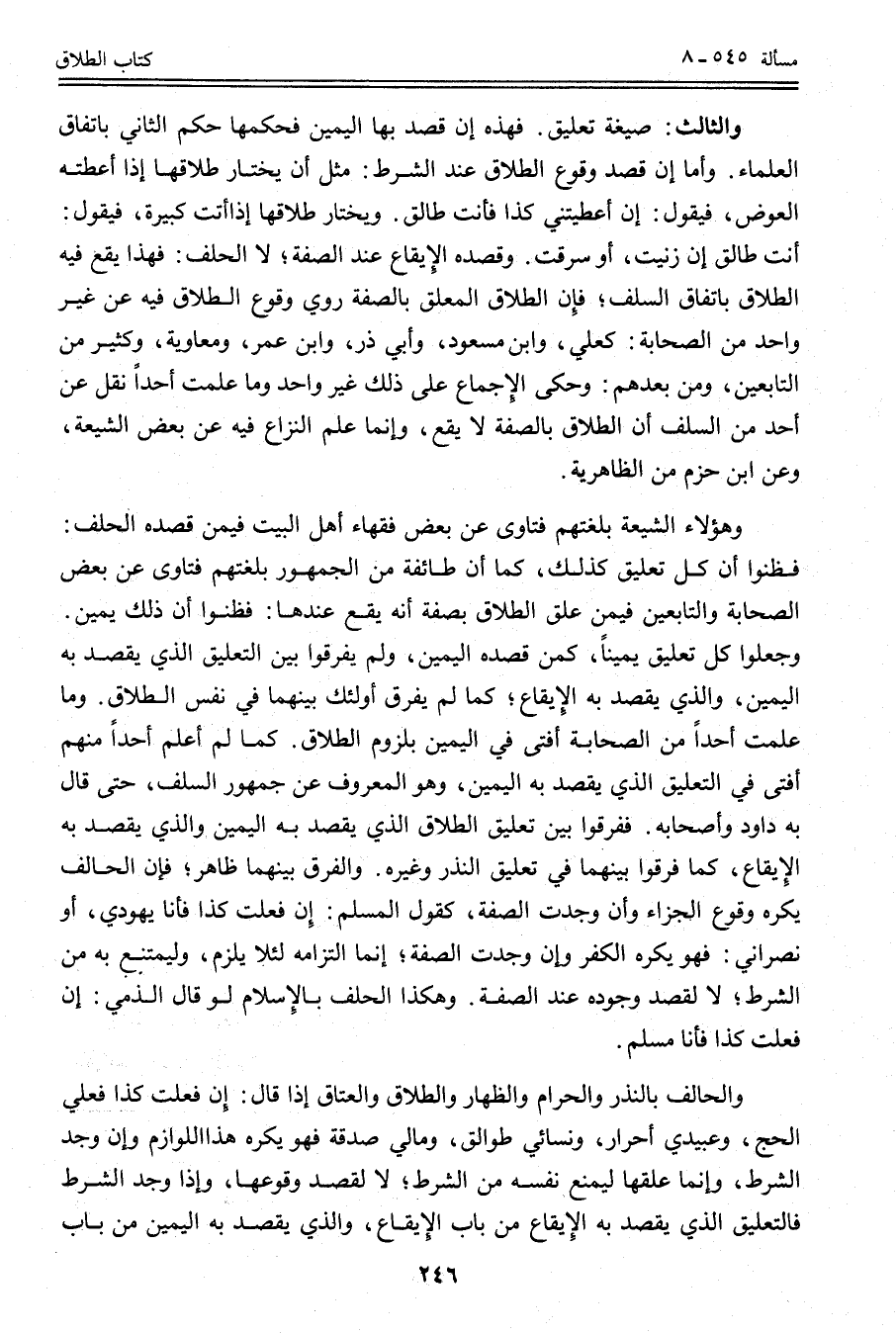 وَهَؤُلَاءِ الشِّيعَةُ بَلَغَتْهُمْ فَتَاوَى عَنْ بَعْضِ فُقَهَاءِ أَهْلِ الْبَيْتِ فِيمَنْ قَصْدُهُ الْحَلِفُ: فَظَنُّوا أَنَّ كُلَّ تَعْلِيقٍ كَذَلِكَ، كَمَا أَنَّ طَائِفَةً مِنْ الْجُمْهُورِ بَلَغَتْهُمْ فَتَاوَى عَنْ بَعْضِ الصَّحَابَةِ وَالتَّابِعِينَ فِيمَنْ عَلَّقَ الطَّلَاقَ بِصِفَةٍ أَنَّهُ يَقَعُ عِنْدَهَا: فَظَنُّوا أَنَّ ذَلِكَ يَمِينٌ.