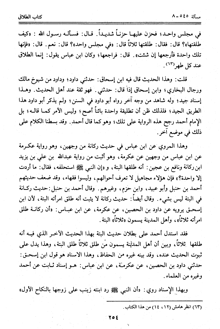 وَهَذَا الْمَرْوِيُّ عَنْ ابْنِ عَبَّاسٍ فِي حَدِيثِ رُكَانَةَ مِنْ وَجْهَيْنِ، وَهُوَ رِوَايَةُ عِكْرِمَةَ عَنْ ابْنِ عَبَّاسٍ مِنْ وَجْهَيْنِ عَنْ عِكْرِمَةَ، وَهُوَ أَثْبَتُ مِنْ رِوَايَةِ عَبْدِ اللَّهِ بْنِ عَلِيِّ بْنِ يَزِيدَ بْنِ رُكَانَةَ وَنَافِعِ بْنِ عُجَيْنٍ: «أَنَّهُ طَلَّقَهَا أَلْبَتَّةَ، وَإنَّ النَّبِيَّ - صَلَّى اللَّهُ عَلَيْهِ وَسَلَّمَ - اسْتَحْلَفَهُ، فَقَالَ: مَا أَرَدْت إلَّا وَاحِدَةً؟» فَإِنَّ هَؤُلَاءِ مَجَاهِيلُ لَا تُعْرَفُ أَحْوَالُهُمْ، وَلَيْسُوا فُقَهَاءَ، وَقَدْ ضَعَّفَ حَدِيثَهُمْ أَحْمَدُ بْنُ حَنْبَلٍ وَأَبُو عُبَيْدٍ، وَابْنُ حَزْمٍ، وَغَيْرُهُمْ. وَقَالَ أَحْمَدُ بْنُ حَنْبَلٍ: حَدِيثُ رُكَانَةَ فِي أَلْبَتَّةَ لَيْسَ بِشَيْءٍ. وَقَالَ أَيْضًا: حَدِيثُ رُكَانَةَ لَا يَثْبُتُ أَنَّهُ طَلَّقَ امْرَأَتَهُ أَلْبَتَّةَ، لِأَنَّ ابْنَ إِسْحَاقَ يَرْوِيهِ عَنْ دَاوُد بْنِ الْحُصَيْنِ، عَنْ عِكْرِمَةَ، عَنْ ابْنِ عَبَّاسٍ: " أَنَّ رُكَانَةَ طَلَّقَ امْرَأَتَهُ ثَلَاثًا "، وَأَهْلُ الْمَدِينَةِ يُسَمُّونَ " ثَلَاثًا " أَلْبَتَّةَ.