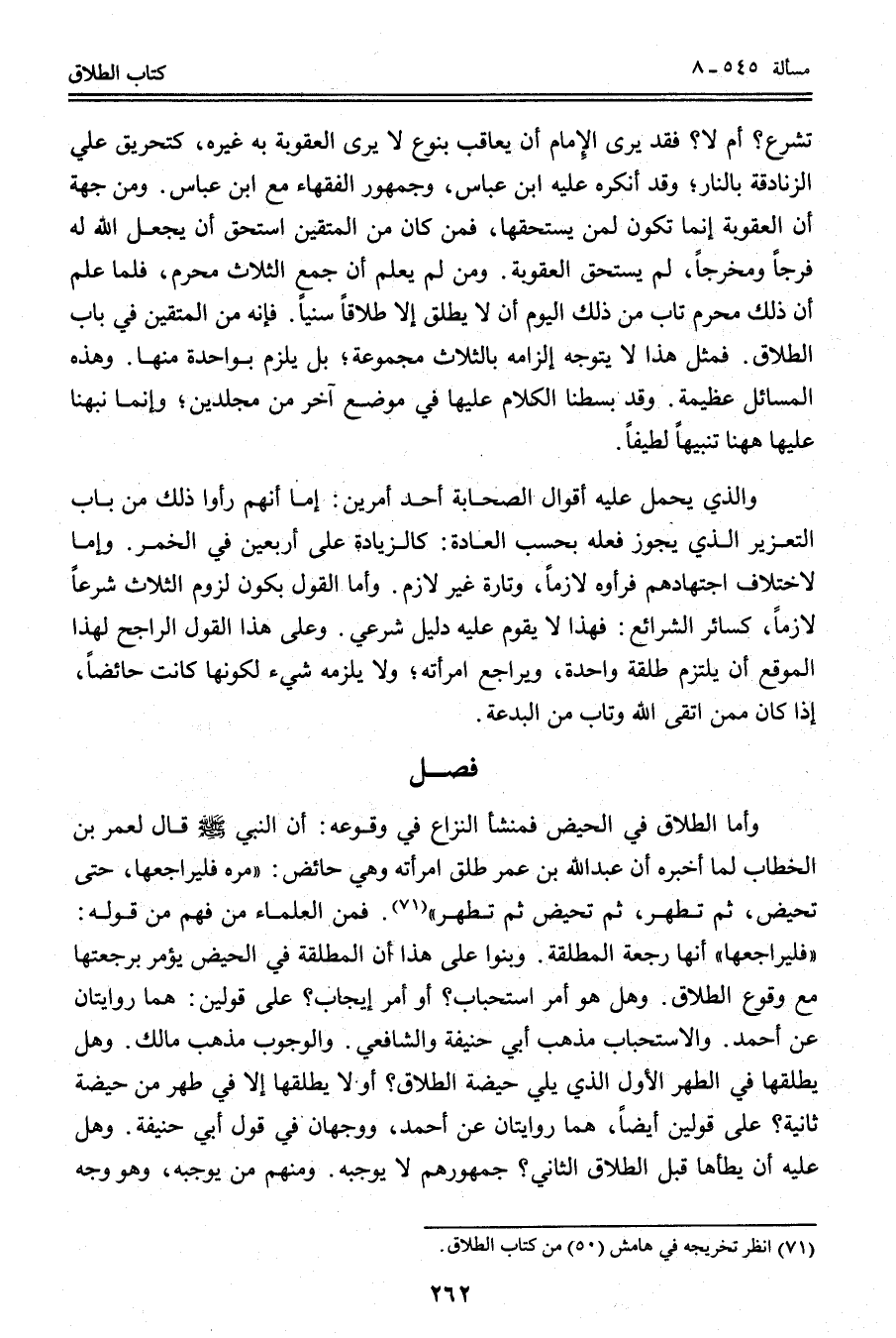 وَأَمَّا الطَّلَاقُ فِي الْحَيْضِ فَمَنْشَأُ النِّزَاعِ فِي وُقُوعِهِ: «أَنَّ النَّبِيَّ - صَلَّى اللَّهُ عَلَيْهِ وَسَلَّمَ - قَالَ لِعُمَرَ بْنِ الْخَطَّابِ لَمَّا أَخْبَرَهُ أَنَّ عَبْدَ اللَّهَ بْنَ عُمَرَ طَلَّقَ امْرَأَتَهُ وَهِيَ حَائِضٌ: مُرْهُ فَلْيُرَاجِعْهَا، حَتَّى تَحِيضَ، ثُمَّ تَطْهُرَ، ثُمَّ تَحِيضَ ثُمَّ تَطْهُرَ» . فَمِنْ الْعُلَمَاءِ مَنْ فَهِمَ مِنْ قَوْلِهِ: «فَلْيُرَاجِعْهَا» أَنَّهَا رَجْعَةُ الْمُطَلَّقَةِ. وَبَنَوْا عَلَى هَذَا أَنَّ الْمُطَلَّقَةَ فِي الْحَيْضِ يُؤْمَرُ بِرَجْعَتِهَا مَعَ وُقُوعِ الطَّلَاقِ.