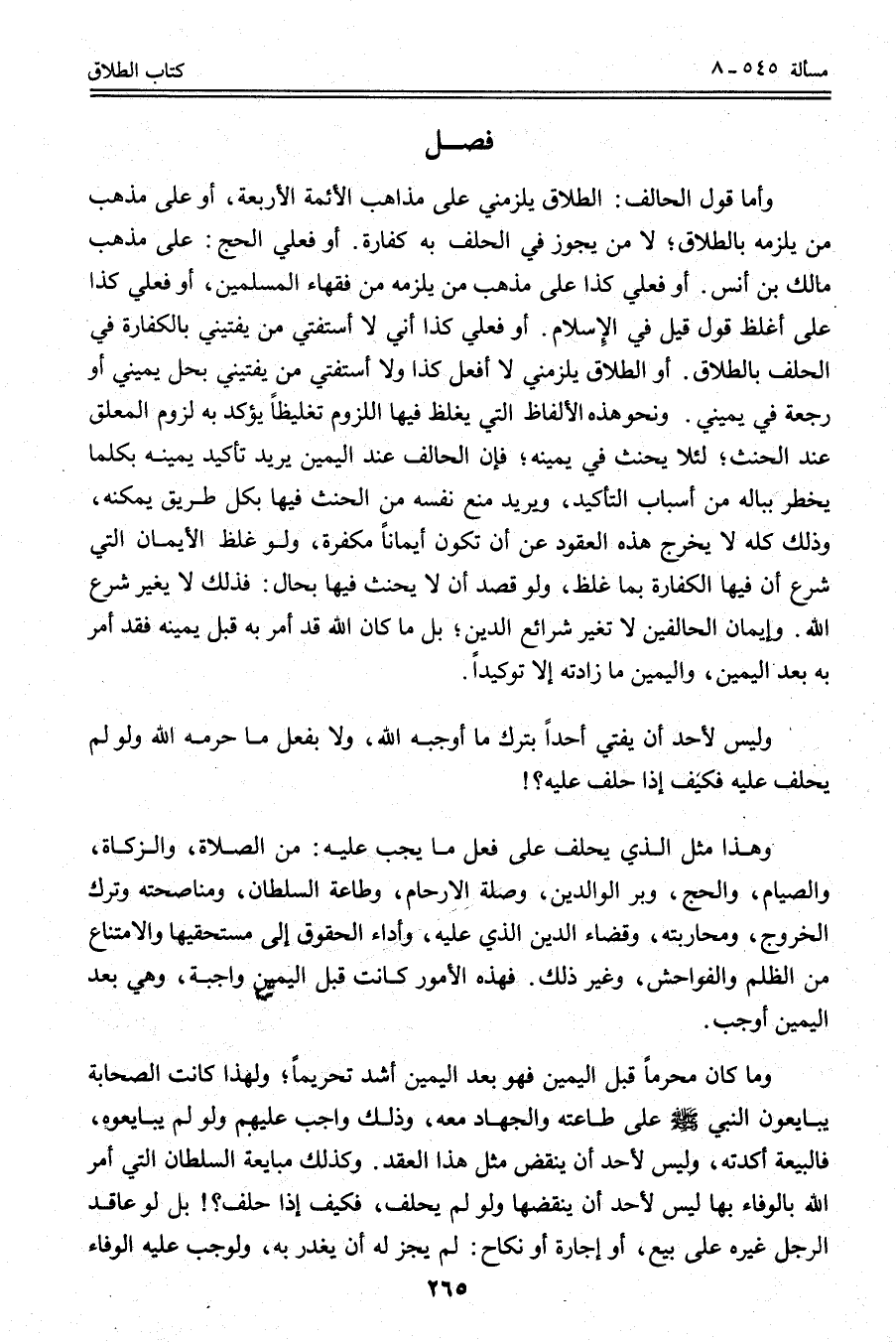 وَأَمَّا قَوْلُ الْحَالِفِ: الطَّلَاقُ يَلْزَمُنِي عَلَى مَذَاهِبِ الْأَئِمَّةِ الْأَرْبَعَةِ، أَوْ عَلَى مَذْهَبِ مَنْ يُلْزِمُهُ بِالطَّلَاقِ؛ لَا مَنْ يُجَوِّزُ فِي الْحَلِفِ بِهِ كَفَّارَةً. أَوْ فَعَلَيَّ الْحَجُّ: عَلَى مَذْهَبِ مَالِكِ بْنِ أَنَسٍ. أَوْ فَعَلَيَّ كَذَا عَلَى مَذْهَبِ مَنْ يُلْزِمُهُ مِنْ فُقَهَاءِ الْمُسْلِمِينَ، أَوْ فَعَلَيَّ كَذَا عَلَى أَغْلَظِ قَوْلٍ قِيلَ فِي الْإِسْلَامِ. أَوْ فَعَلَيَّ كَذَا أَنِّي لَا أَسْتَفْتِي مَنْ يُفْتِينِي بِالْكَفَّارَةِ فِي الْحَلِفِ بِالطَّلَاقِ. أَوْ الطَّلَاقُ يَلْزَمُنِي لَا أَفْعَلُ كَذَا وَلَا أَسْتَفْتِي مَنْ يُفْتِينِي بِحِلِّ يَمِينِي أَوْ رَجْعَةٍ فِي يَمِينِي. وَنَحْوِ هَذِهِ الْأَلْفَاظِ الَّتِي يَغْلُظُ فِيهَا اللُّزُومُ تَغْلِيظًا يُؤَكِّدُ بِهِ لُزُومَ الْمُعَلَّقِ عِنْدَ الْحِنْثِ؛ لِئَلَّا يَحْنَثَ فِي يَمِينِهِ؛ فَإِنَّ الْحَالِفَ عِنْدَ الْيَمِينِ يُرِيدُ تَأْكِيدَ يَمِينِهِ بِكُلَّمَا يَخْطِرُ بِبَالِهِ مِنْ أَسْبَابِ التَّأْكِيدِ، وَيُرِيدُ مَنْعَ نَفْسِهِ مِنْ الْحِنْثِ فِيهَا بِكُلِّ طَرِيقٍ يُمْكِنُهُ، وَذَلِكَ كُلُّهُ لَا يُخْرِجُ هَذِهِ الْعُقُودَ عَنْ أَنْ تَكُونَ أَيْمَانًا مُكَفَّرَةً، وَلَوْ غَلَّظَ الْأَيْمَانَ الَّتِي شُرِعَ أَنَّ فِيهَا الْكَفَّارَةَ بِمَا غُلِّظَ، وَلَوْ قَصَدَ أَنْ لَا يَحْنَثَ فِيهَا بِحَالٍ: فَذَلِكَ لَا يُغَيِّرُ شَرْعَ اللَّهِ. وَأَيْمَانُ الْحَالِفِينَ لَا تُغَيِّرُ شَرَائِعَ الدِّينِ؛ بَلْ مَا كَانَ اللَّهُ قَدْ أَمَرَ بِهِ قَبْلَ يَمِينِهِ فَقَدْ أَمَرَ بِهِ بَعْدَ الْيَمِينِ، وَالْيَمِينُ مَا زَادَتْهُ إلَّا تَوْكِيدًا.