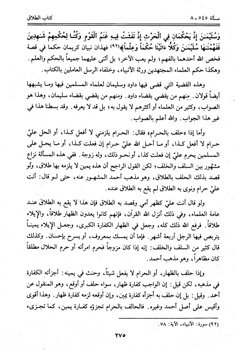 وَهَذِهِ الْقَضِيَّةُ الَّتِي قَضَى فِيهَا دَاوُد وَسُلَيْمَانُ لِعُلَمَاءِ الْمُسْلِمِينَ فِيهَا وَمَا يُشْبِهُهَا أَيْضًا قَوْلَانِ. مِنْهُمْ مَنْ يَقْضِي بِقَضَاءِ دَاوُد. وَمِنْهُمْ مَنْ يَقْضِي بِقَضَاءِ سُلَيْمَانَ، وَهَذَا هُوَ الصَّوَابُ، وَكَثِيرٌ مِنْ الْعُلَمَاءِ أَوْ أَكْثَرُهُمْ لَا يَقُولُ بِهِ؛ بَلْ قَدْ لَا يَعْرِفُهُ. وَقَدْ بَسَطْنَا هَذَا فِي غَيْرِ هَذَا الْجَوَابِ. وَاَللَّهُ أَعْلَمُ بِالصَّوَابِ.