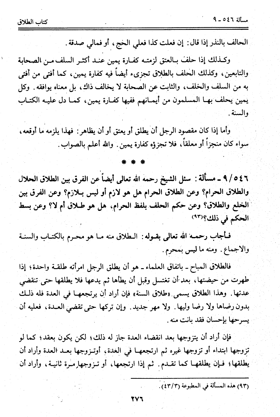 سُئِلَ الشَّيْخُ - رَحِمَهُ اللَّهُ تَعَالَى - أَيْضًا عَنْ الْفَرْقِ بَيْنَ الطَّلَاقِ الْحَلَالِ وَالطَّلَاقِ الْحَرَامِ؟ وَعَنْ الطَّلَاقِ الْحَرَامِ هَلْ هُوَ لَازِمٌ أَوْ لَيْسَ بِلَازِمٍ؟ وَعَنْ الْفَرْقِ بَيْنَ الْخُلْعِ وَالطَّلَاقِ؟ وَعَنْ حُكْمِ الْحَلِفِ بِلَفْظِ الْحَرَامِ، هَلْ هُوَ طَلَاقٌ أَمْ لَا؟ وَعَنْ بَسْطِ الْحُكْمِ فِي ذَلِكَ؟