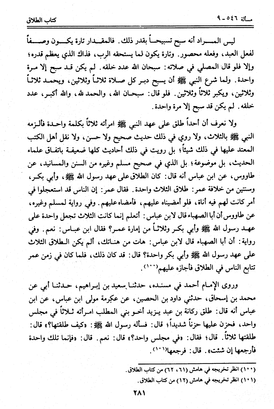 وَلَا نَعْرِفُ أَنَّ أَحَدًا طَلَّقَ عَلَى عَهْدِ النَّبِيِّ - صَلَّى اللَّهُ عَلَيْهِ وَسَلَّمَ - امْرَأَتَهُ ثَلَاثًا بِكَلِمَةٍ وَاحِدَةٍ فَأَلْزَمَهُ النَّبِيُّ - صَلَّى اللَّهُ عَلَيْهِ وَسَلَّمَ - بِالثَّلَاثِ، وَلَا رُوِيَ فِي ذَلِكَ حَدِيثٌ صَحِيحٌ وَلَا حَسَنٌ، وَلَا نَقَلَ أَهْلُ الْكُتُبِ الْمُعْتَمَدِ عَلَيْهَا فِي ذَلِكَ شَيْئًا؛ بَلْ رُوِيَتْ فِي ذَلِكَ أَحَادِيثُ كُلُّهَا ضَعِيفَةٌ بِاتِّفَاقِ عُلَمَاءِ الْحَدِيثِ، بَلْ مَوْضُوعَةٌ؛ بَلْ الَّذِي فِي صَحِيحِ مُسْلِمٍ وَغَيْرِهِ مِنْ السُّنَنِ وَالْمَسَانِيدِ، عَنْ طَاوُسٍ، عَنْ ابْنِ عَبَّاسٍ أَنَّهُ قَالَ: «كَانَ الطَّلَاقُ عَلَى عَهْدِ رَسُولِ اللَّهِ - صَلَّى اللَّهُ عَلَيْهِ وَسَلَّمَ - وَأَبِي بَكْرٍ، وَسَنَتَيْنِ مِنْ خِلَافَةِ عُمَرَ: طَلَاقُ الثَّلَاثِ وَاحِدَةٌ. فَقَالَ عُمَرُ: إنَّ النَّاسَ قَدْ اسْتَعْجَلُوا فِي أَمْرٍ كَانَتْ لَهُمْ فِيهِ أَنَاةٌ، فَلَوْ أَمْضَيْنَاهُ عَلَيْهِمْ، فَأَمْضَاهُ عَلَيْهِمْ» .