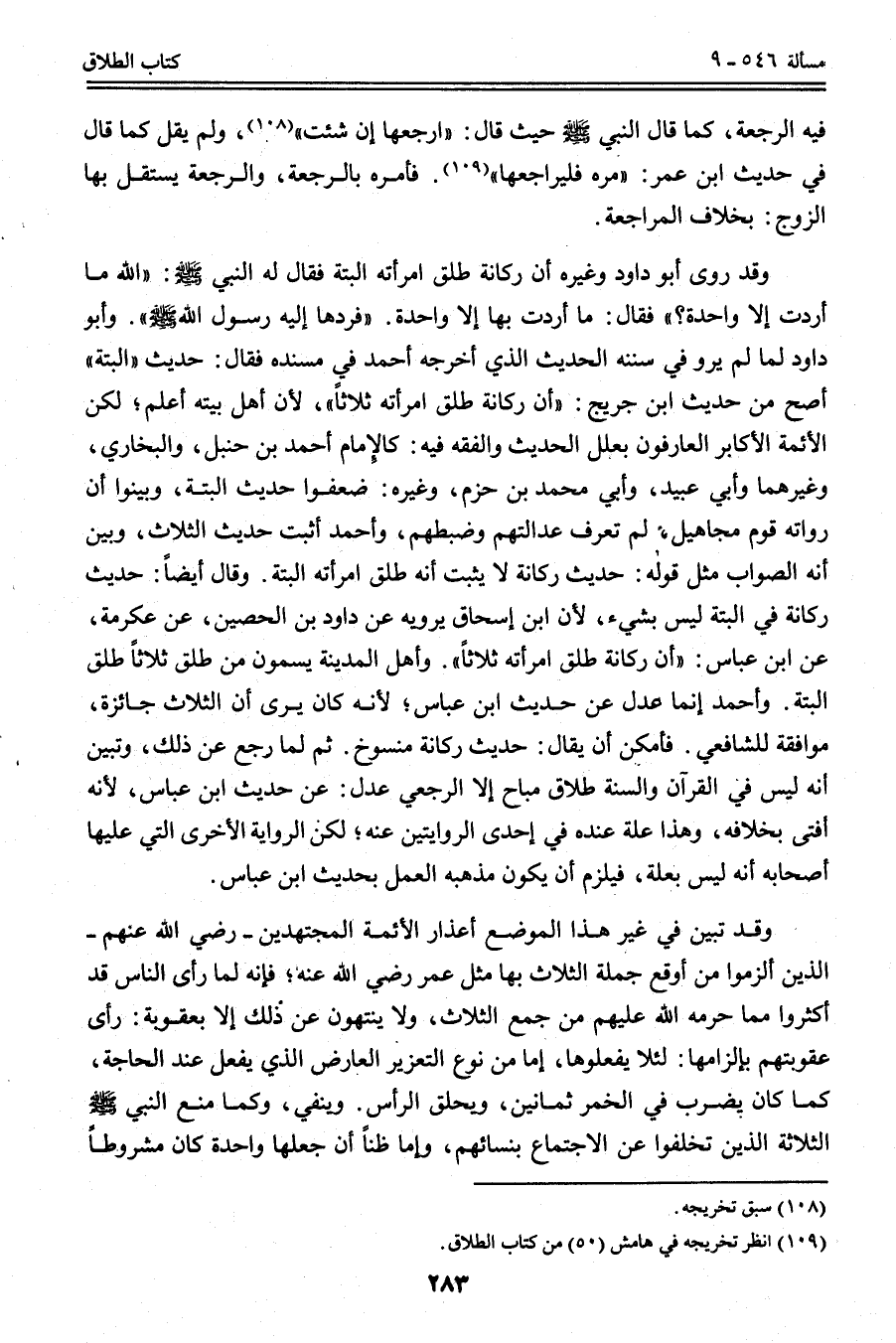 وَقَالَ أَيْضًا: حَدِيثُ رُكَانَةَ فِي " أَلْبَتَّةَ " لَيْسَ بِشَيْءٍ، لِأَنَّ ابْنَ إِسْحَاقَ يَرْوِيهِ عَنْ دَاوُد بْنِ الْحُصَيْنِ، عَنْ عِكْرِمَةَ، عَنْ ابْنِ عَبَّاسٍ: «أَنَّ رُكَانَةَ طَلَّقَ امْرَأَتَهُ ثَلَاثًا» . وَأَهْلُ الْمَدِينَةِ يُسَمُّونَ مَنْ طَلَّقَ ثَلَاثًا طَلَّقَ أَلْبَتَّةَ. وَأَحْمَدُ إنَّمَا عَدَلَ عَنْ حَدِيثِ ابْنِ عَبَّاسٍ؛ لِأَنَّهُ كَانَ يَرَى أَنَّ الثَّلَاثَ جَائِزَةٌ، مُوَافَقَةً لِلشَّافِعِيِّ. فَأَمْكَنَ أَنْ يُقَالَ: حَدِيثُ رُكَانَةَ مَنْسُوخٌ. ثُمَّ لَمَّا رَجَعَ عَنْ ذَلِكَ، وَتَبَيَّنَ أَنَّهُ لَيْسَ فِي الْقُرْآنِ وَالسُّنَّةِ طَلَاقٌ مُبَاحٌ إلَّا الرَّجْعِيُّ عَدَلَ: عَنْ حَدِيثِ ابْنِ عَبَّاسٍ، لِأَنَّهُ أَفْتَى بِخِلَافِهِ، وَهَذَا عِلَّةٌ عِنْدَهُ فِي إحْدَى الرِّوَايَتَيْنِ عَنْهُ؛ لَكِنَّ الرِّوَايَةَ الْأُخْرَى الَّتِي عَلَيْهَا أَصْحَابُهُ أَنَّهُ لَيْسَ بِعِلَّةٍ، فَيَلْزَمُ أَنْ يَكُونَ مَذْهَبُهُ الْعَمَلَ بِحَدِيثِ ابْنِ عَبَّاسٍ.