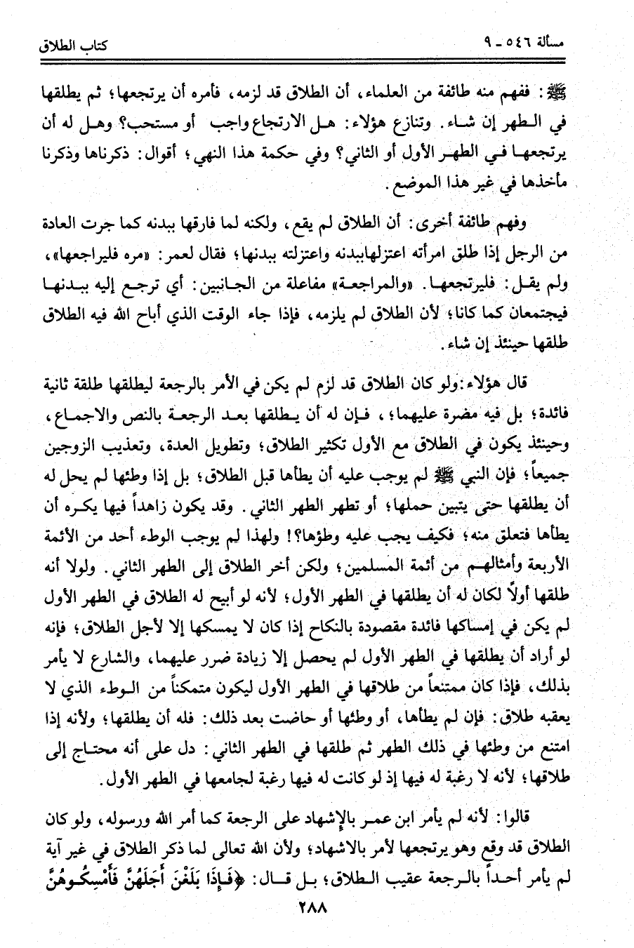 - صَلَّى اللَّهُ عَلَيْهِ وَسَلَّمَ -: فَفَهِمَ مِنْهُ طَائِفَةٌ مِنْ الْعُلَمَاءِ، أَنَّ الطَّلَاقَ قَدْ لَزِمَهُ، فَأَمَرَهُ أَنْ يَرْتَجِعَهَا؛ ثُمَّ يُطَلِّقَهَا فِي الطُّهْرِ إنْ شَاءَ. وَتَنَازَعَ هَؤُلَاءِ: هَلْ الِارْتِجَاعُ وَاجِبٌ أَوْ مُسْتَحَبٌّ؟ وَهَلْ لَهُ أَنْ يَرْتَجِعَهَا فِي الطُّهْرِ الْأَوَّلِ أَوْ الثَّانِي؟ وَفِي حِكْمَةِ هَذَا النَّهْيِ؛ أَقْوَالٌ: ذَكَرْنَاهَا وَذَكَرْنَا مَأْخَذَهَا فِي غَيْرِ هَذَا الْمَوْضِعِ.