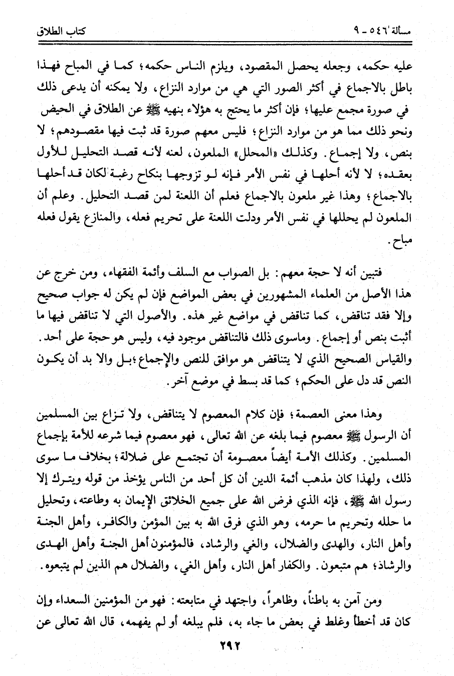 وَهَذَا مَعْنَى الْعِصْمَةِ؛ فَإِنَّ كَلَامَ الْمَعْصُومِ لَا يَتَنَاقَضُ، وَلَا نِزَاعَ بَيْنَ الْمُسْلِمِينَ أَنَّ الرَّسُولَ - صَلَّى اللَّهُ عَلَيْهِ وَسَلَّمَ - مَعْصُومٌ فِيمَا بَلَّغَهُ عَنْ اللَّهِ تَعَالَى، فَهُوَ مَعْصُومٌ فِيمَا شَرَعَهُ لِلْأُمَّةِ بِإِجْمَاعِ الْمُسْلِمِينَ.