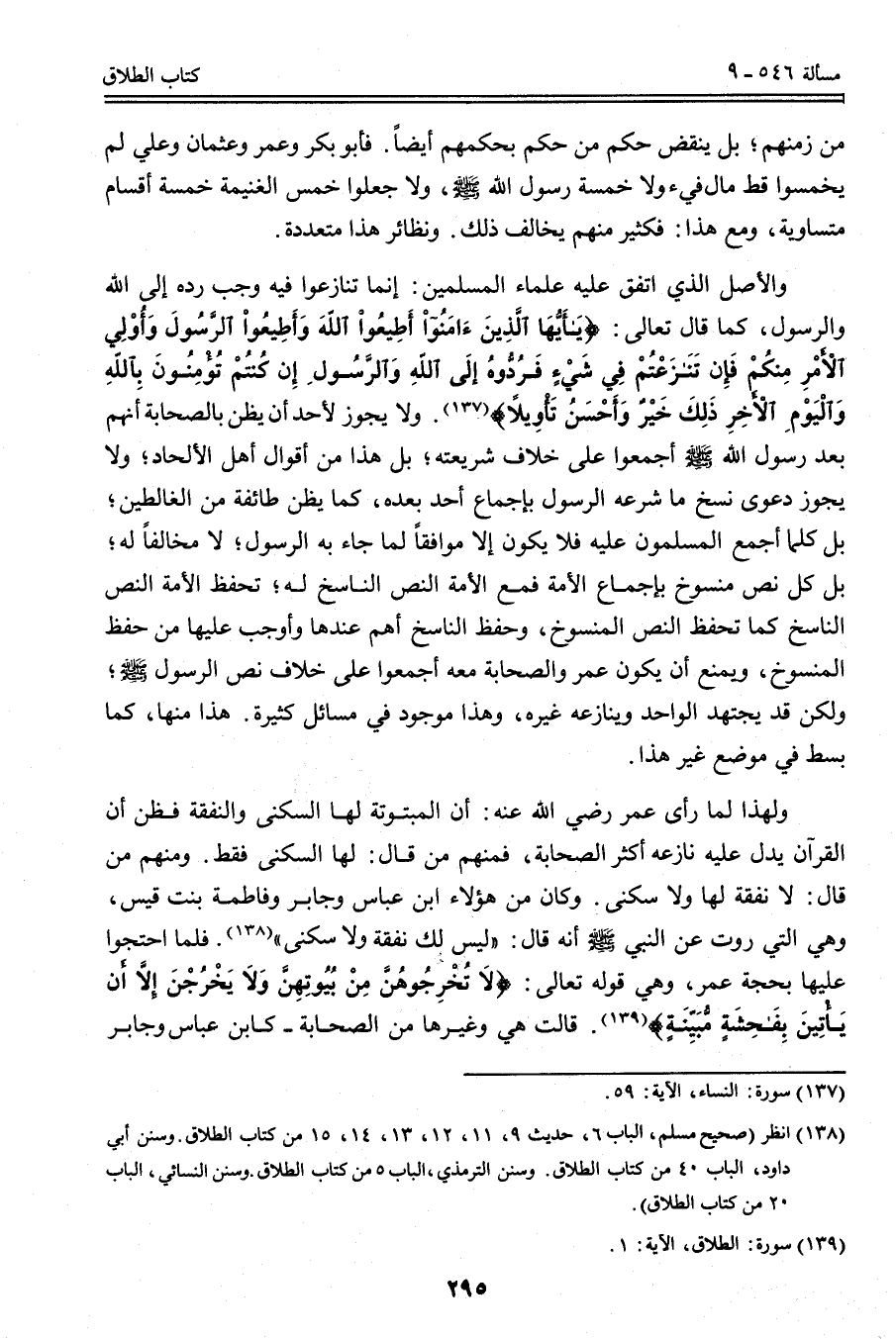 وَلِهَذَا لَمَّا رَأَى عُمَرُ - رَضِيَ اللَّهُ عَنْهُ -: أَنَّ الْمَبْتُوتَةَ لَهَا السُّكْنَى وَالنَّفَقَةُ فَظَنَّ أَنَّ الْقُرْآنَ يَدُلُّ عَلَيْهِ نَازَعَهُ أَكْثَرُ الصَّحَابَةِ، فَمِنْهُمْ مَنْ قَالَ: لَهَا السُّكْنَى فَقَطْ.