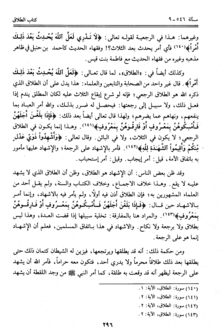 وَكَذَلِكَ أَيْضًا فِي: " الطَّلَاقِ "، لَمَّا قَالَ تَعَالَى: {لَعَلَّ اللَّهَ يُحْدِثُ بَعْدَ ذَلِكَ أَمْرًا} [الطلاق: 1] . قَالَ غَيْرُ وَاحِدٍ مِنْ الصَّحَابَةِ وَالتَّابِعِينَ وَالْعُلَمَاءِ: هَذَا يَدُلُّ عَلَى أَنَّ الطَّلَاقَ الَّذِي ذَكَرَهُ اللَّهُ هُوَ الطَّلَاقُ الرَّجْعِيُّ؛ فَإِنَّهُ لَوْ شَرَعَ إيقَاعَ الثَّلَاثِ عَلَيْهِ لَكَانَ الْمُطَلِّقُ يَنْدَمُ إذَا فَعَلَ ذَلِكَ، وَلَا سَبِيلَ إلَى رَجْعَتِهَا: فَيَحْصُلُ لَهُ ضَرَرٌ بِذَلِكَ، وَاَللَّهُ أَمَرَ الْعِبَادَ بِمَا يَنْفَعُهُمْ، وَنَهَاهُمْ عَمَّا يَضُرُّهُمْ؛ وَلِهَذَا قَالَ تَعَالَى أَيْضًا بَعْدَ ذَلِكَ: {فَإِذَا بَلَغْنَ أَجَلَهُنَّ فَأَمْسِكُوهُنَّ بِمَعْرُوفٍ أَوْ فَارِقُوهُنَّ بِمَعْرُوفٍ} [الطلاق: 2] . وَهَذَا إنَّمَا يَكُونُ فِي الطَّلَاقِ الرَّجْعِيِّ؛ لَا يَكُونُ فِي الثَّلَاثِ، وَلَا فِي الْبَائِنِ. وَقَالَ تَعَالَى: {وَأَشْهِدُوا ذَوَيْ عَدْلٍ مِنْكُمْ وَأَقِيمُوا الشَّهَادَةَ لِلَّهِ} [الطلاق: 2] . فَأَمَرَ بِالْإِشْهَادِ عَلَى الرَّجْعَةِ؛ وَالْإِشْهَادُ عَلَيْهَا مَأْمُورٌ بِهِ بِاتِّفَاقِ الْأُمَّةِ، قِيلَ: أَمْرَ إيجَابٍ. وَقِيلَ: أَمْرَ اسْتِحْبَابٍ.