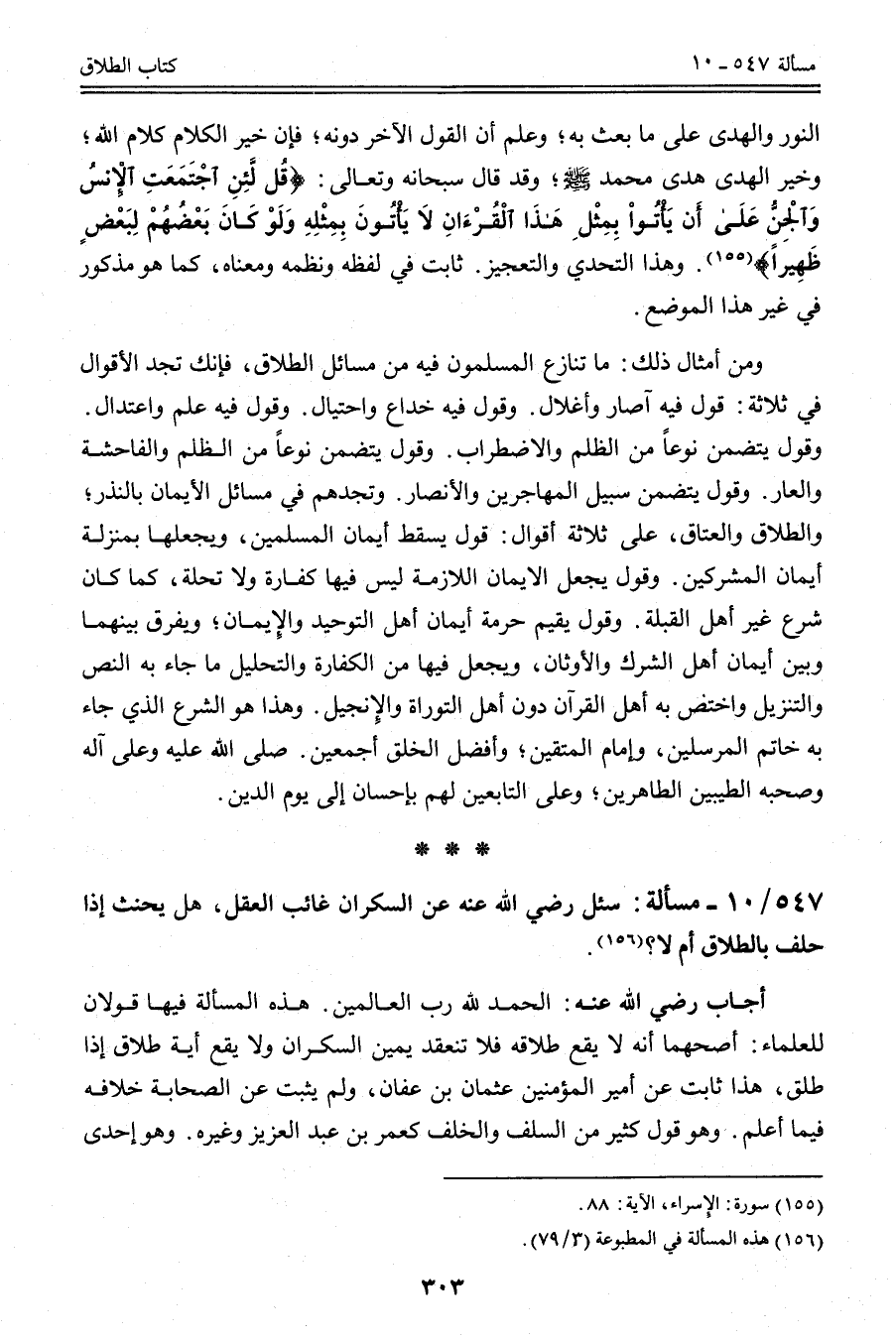 وَمِنْ أَمْثَالِ ذَلِكَ: مَا تَنَازَعَ الْمُسْلِمُونَ فِيهِ مِنْ مَسَائِلِ الطَّلَاقِ، فَإِنَّك تَجِدُ الْأَقْوَالَ فِي ثَلَاثَةٍ: قَوْلٌ فِيهِ آصَارٌ وَأَغْلَالٌ. وَقَوْلٌ فِيهِ خِدَاعٌ وَاحْتِيَالٌ. وَقَوْلٌ فِيهِ عِلْمٌ وَاعْتِدَالٌ. وَقَوْلٌ يَتَضَمَّنُ نَوْعًا مِنْ الظُّلْمِ وَالِاضْطِرَابِ. وَقَوْلٌ يَتَضَمَّنُ نَوْعًا مِنْ الظُّلْمِ وَالْفَاحِشَةِ وَالْعَارِ. وَقَوْلٌ يَتَضَمَّنُ سَبِيلَ الْمُهَاجِرِينَ وَالْأَنْصَارِ. وَتَجِدُهُمْ فِي مَسَائِلِ الْأَيْمَانِ بِالنَّذْرِ؛ وَالطَّلَاقِ وَالْعَتَاقِ، عَلَى ثَلَاثَةِ أَقْوَالٍ: قَوْلٌ يُسْقِطُ أَيْمَانَ الْمُسْلِمِينَ، وَيَجْعَلُهَا بِمَنْزِلَةِ أَيْمَانِ الْمُشْرِكِينَ. وَقَوْلٌ يَجْعَلُ الْأَيْمَانَ اللَّازِمَةَ لَيْسَ فِيهَا كَفَّارَةٌ وَلَا تَحِلَّةٌ، كَمَا كَانَ شَرْعُ غَيْرِ أَهْلِ الْقِبْلَةِ. وَقَوْلٌ يُقِيمُ حُرْمَةَ أَيْمَانِ أَهْلِ التَّوْحِيدِ وَالْإِيمَانِ؛ وَيُفَرِّقُ بَيْنَهُمَا وَبَيْنَ أَيْمَانِ أَهْلِ الشِّرْكِ وَالْأَوْثَانِ، وَيَجْعَلُ فِيهَا مِنْ الْكَفَّارَةِ وَالتَّحْلِيلِ مَا جَاءَ بِهِ النَّصُّ وَالتَّنْزِيلُ وَاخْتَصَّ بِهِ أَهْلُ الْقُرْآنِ دُونَ أَهْلِ التَّوْرَاةِ وَالْإِنْجِيلِ. وَهَذَا هُوَ الشَّرْعُ الَّذِي جَاءَ بِهِ خَاتَمُ الْمُرْسَلِينَ، وَإِمَامُ الْمُتَّقِينَ؛ وَأَفْضَلُ الْخَلْقِ أَجْمَعِينَ. - صَلَّى اللَّهُ عَلَيْهِ وَآلِهِ وَصَحْبِهِ وَسَلَّمَ - الطَّيِّبِينَ الطَّاهِرِينَ؛ وَعَلَى التَّابِعِينَ لَهُمْ بِإِحْسَانٍ إلَى يَوْمِ الدِّينِ.