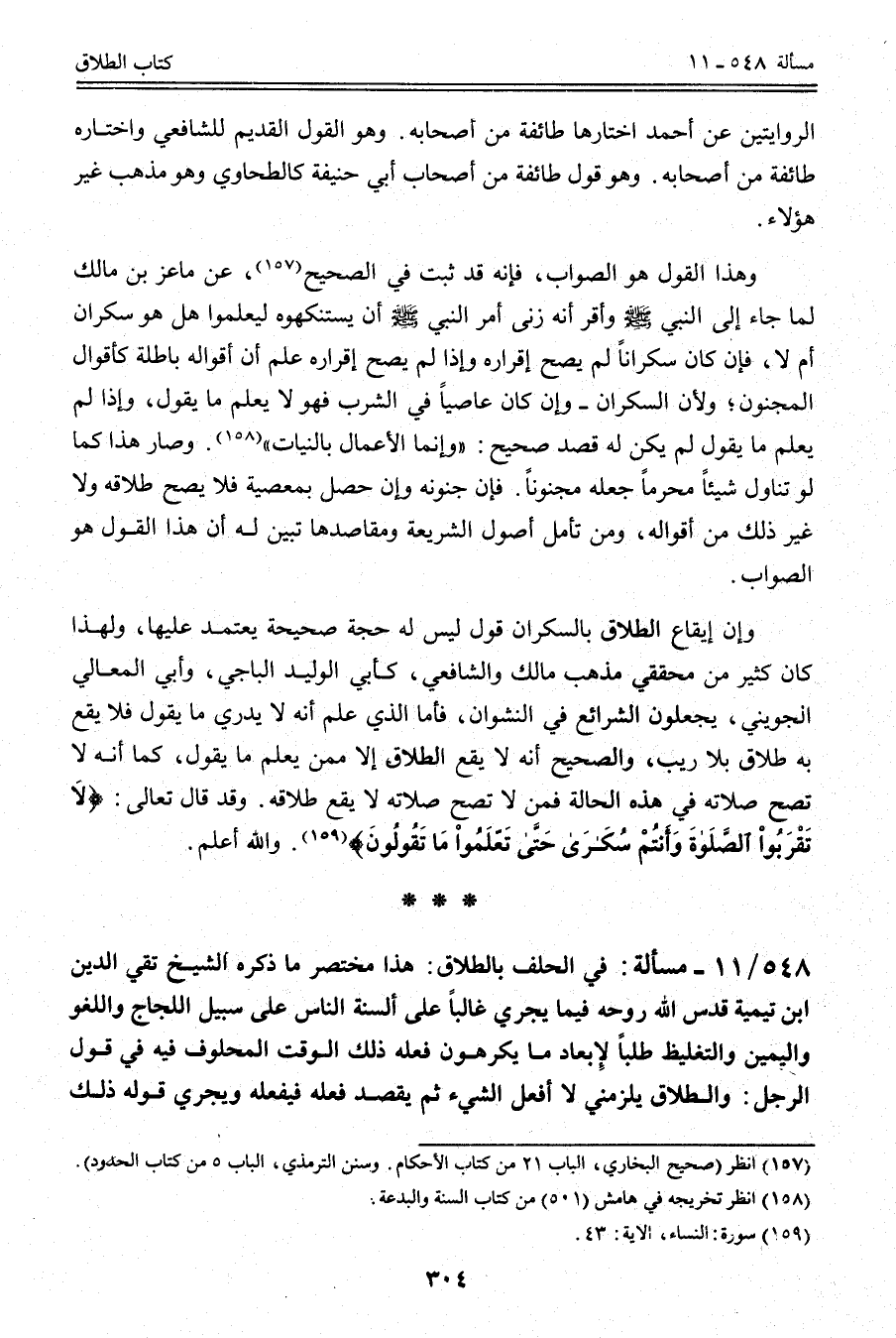 وَإِنَّ إيقَاعَ الطَّلَاقِ بِالسَّكْرَانِ قَوْلٌ لَيْسَ لَهُ حُجَّةٌ صَحِيحَةٌ يَعْتَمِدُ عَلَيْهَا، وَلِهَذَا كَانَ كَثِيرٌ مِنْ مُحَقِّقِي مَذْهَبِ مَالِكٍ وَالشَّافِعِيِّ، كَأَبِي الْوَلِيدِ الْبَاجِيَّ، وَأَبِي الْمَعَالِي الْجُوَيْنِيِّ، يَجْعَلُونَ الشَّرَائِعَ فِي النَّشْوَانِ، فَأَمَّا الَّذِي عُلِمَ أَنَّهُ لَا يَدْرِي مَا يَقُولُ فَلَا يَقَعُ بِهِ طَلَاقٌ بِلَا رَيْبٍ، وَالصَّحِيحُ أَنَّهُ لَا يَقَعُ الطَّلَاقُ إلَّا مِمَّنْ يَعْلَمُ مَا يَقُولُ، كَمَا أَنَّهُ لَا تَصِحُّ صَلَاتُهُ فِي هَذِهِ الْحَالَةِ فَمَنْ لَا تَصِحُّ صَلَاتُهُ لَا يَقَعُ طَلَاقُهُ.