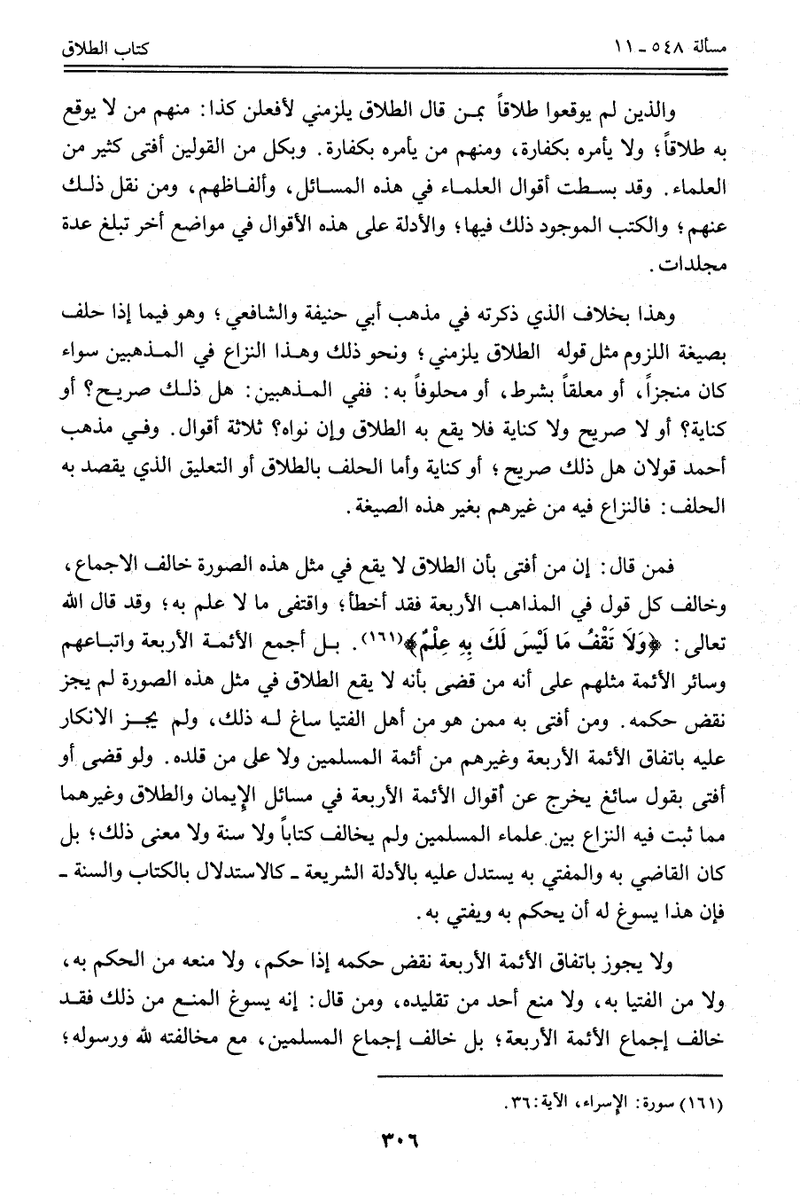 وَهَذَا بِخِلَافِ الَّذِي ذَكَرْتُهُ فِي مَذْهَبِ أَبِي حَنِيفَةَ وَالشَّافِعِيِّ؛ وَهُوَ فِيمَا إذَا حَلَفَ بِصِيغَةِ اللُّزُومِ مِثْلُ قَوْلِهِ الطَّلَاقُ يَلْزَمُنِي؛ وَنَحْوُ ذَلِكَ وَهَذَا النِّزَاعُ فِي الْمَذْهَبَيْنِ سَوَاءٌ كَانَ مُنَجَّزًا، أَوْ مُعَلَّقًا بِشَرْطٍ، أَوْ مَحْلُوفًا بِهِ: فَفِي الْمَذْهَبَيْنِ: هَلْ ذَلِكَ صَرِيحٌ؟ أَوْ كِنَايَةٌ؟ أَوْ لَا صَرِيحٌ وَلَا كِنَايَةٌ فَلَا يَقَعُ بِهِ الطَّلَاقُ وَإِنْ نَوَاهُ؟ ثَلَاثَةُ أَقْوَالٍ. وَفِي مَذْهَبِ أَحْمَدَ قَوْلَانِ هَلْ ذَلِكَ صَرِيحٌ؛ أَوْ كِنَايَةٌ وَأَمَّا الْحَلِفُ بِالطَّلَاقِ أَوْ التَّعْلِيقِ الَّذِي يَقْصِدُ بِهِ الْحَلِفَ: فَالنِّزَاعُ فِيهِ مِنْ غَيْرِهِمْ بِغَيْرِ هَذِهِ الصِّيغَةِ. فَمَنْ قَالَ: إنَّ مَنْ أَفْتَى بِأَنَّ الطَّلَاقَ لَا يَقَعُ فِي مِثْلِ هَذِهِ الصُّورَةِ خَالَفَ الْإِجْمَاعَ، وَخَالَفَ كُلَّ قَوْلٍ فِي الْمَذَاهِبِ الْأَرْبَعَةِ فَقَدْ أَخْطَأَ؛ وَاقْتَفَى مَا لَا عِلْمَ لَهُ بِهِ؛ وَقَدْ قَالَ اللَّهُ تَعَالَى: {وَلا تَقْفُ مَا لَيْسَ لَكَ بِهِ عِلْمٌ} [الإسراء: 36] . بَلْ أَجْمَعَ الْأَئِمَّةُ الْأَرْبَعَةُ وَأَتْبَاعُهُمْ وَسَائِرُ الْأَئِمَّةِ مِثْلُهُمْ عَلَى أَنَّهُ مَنْ قَضَى بِأَنَّهُ لَا يَقَعُ الطَّلَاقُ فِي مِثْلِ هَذِهِ الصُّورَةِ لَمْ يَجُزْ نَقْضُ حُكْمِهِ.