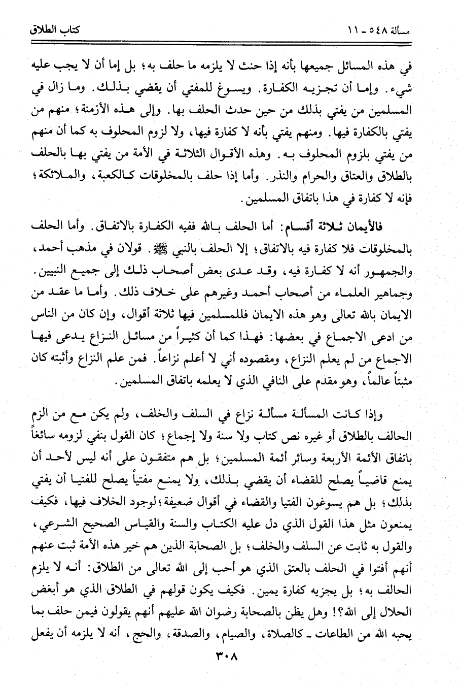 وَإِذَا كَانَتْ الْمَسْأَلَةُ مَسْأَلَةَ نِزَاعٍ فِي السَّلَفِ وَالْخَلْفِ، وَلَمْ يَكُنْ مَعَ مَنْ أَلْزَمَ الْحَالِفَ بِالطَّلَاقِ أَوْ غَيْرَهُ نَصُّ كِتَابٍ وَلَا سُنَّةٍ وَلَا إجْمَاعٍ؛ كَانَ الْقَوْلُ يَنْفِي لُزُومَهُ سَائِغًا بِاتِّفَاقِ الْأَئِمَّةِ الْأَرْبَعَةِ وَسَائِرِ أَئِمَّةِ الْمُسْلِمِينَ؛ بَلْ هُمْ مُتَّفِقُونَ عَلَى أَنَّهُ لَيْسَ لِأَحَدٍ أَنْ يَمْنَعَ قَاضِيًا يَصْلُحُ لِلْقَضَاءِ أَنْ يَقْضِيَ بِذَلِكَ، وَلَا يَمْنَعَ مُفْتِيًا يَصْلُحُ لِلْفُتْيَا أَنْ يُفْتِيَ بِذَلِكَ؛ بَلْ هُمْ يُسَوِّغُونَ الْفُتْيَا وَالْقَضَاءَ فِي أَقْوَالٍ ضَعِيفَةٍ؛ لِوُجُودِ الْخِلَافِ فِيهَا، فَكَيْفَ يَمْنَعُونَ مِثْلَ هَذَا الْقَوْلَ الَّذِي دَلَّ عَلَيْهِ الْكِتَابُ وَالسُّنَّةُ وَالْقِيَاسُ الصَّحِيحُ الشَّرْعِيُّ، وَالْقَوْلُ بِهِ ثَابِتٌ عَنْ السَّلَفِ وَالْخَلَفِ؛ بَلْ الصَّحَابَةُ الَّذِينَ هُمْ خَيْرُ هَذِهِ الْأُمَّةِ ثَبَتَ عَنْهُمْ أَنَّهُمْ أَفْتَوْا فِي الْحَلِفِ بِالْعِتْقِ الَّذِي هُوَ أَحَبُّ إلَى اللَّهِ تَعَالَى مِنْ الطَّلَاقِ: أَنَّهُ لَا يَلْزَمُ الْحَالِفَ بِهِ؛ بَلْ يَجْزِيهِ كَفَّارَةُ يَمِينٍ. فَكَيْفَ يَكُونُ قَوْلُهُمْ فِي الطَّلَاقِ الَّذِي هُوَ أَبْغَضُ الْحَلَالِ إلَى اللَّهِ؟ ، وَهَلْ يُظَنُّ بِالصَّحَابَةِ - رِضْوَانُ اللَّهِ عَلَيْهِمْ - أَنَّهُمْ يَقُولُونَ فِيمَنْ حَلَفَ بِمَا يُحِبُّهُ اللَّهُ مِنْ الطَّاعَاتِ - كَالصَّلَاةِ، وَالصِّيَامِ، وَالصَّدَقَةِ، وَالْحَجِّ، أَنَّهُ لَا يَلْزَمُهُ أَنْ يَفْعَلَ