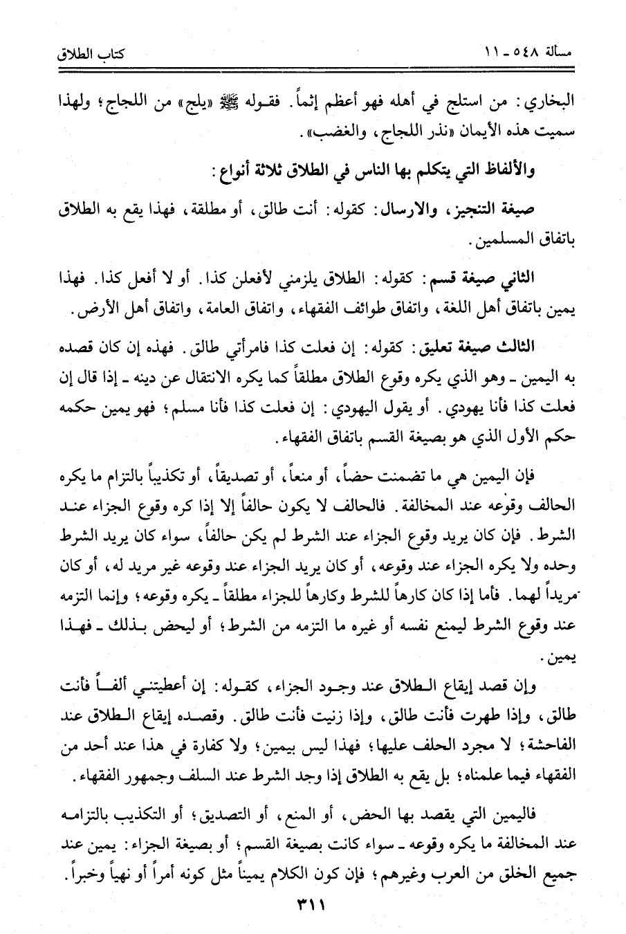 الْبُخَارِيُّ: مَنْ اسْتَلَجَّ فِي أَهْلِهِ فَهُوَ أَعْظَمُ إثْمًا. فَقَوْلُهُ - صَلَّى اللَّهُ عَلَيْهِ وَسَلَّمَ - " يَلِجُّ " مِنْ اللَّجَاجِ؛ وَلِهَذَا سُمِّيَتْ هَذِهِ الْأَيْمَانُ " نَذْرُ اللَّجَاجِ، وَالْغَضَبِ ". وَالْأَلْفَاظُ الَّتِي يَتَكَلَّمُ بِهَا النَّاسُ فِي الطَّلَاقِ ثَلَاثَةُ أَنْوَاعٍ: صِيغَةُ التَّنْجِيزِ، وَالْإِرْسَالِ: كَقَوْلِهِ: أَنْتِ طَالِقٌ، أَوْ مُطَلَّقَةٌ، فَهَذَا يَقَعُ بِهِ الطَّلَاقُ بِاتِّفَاقِ الْمُسْلِمِينَ.