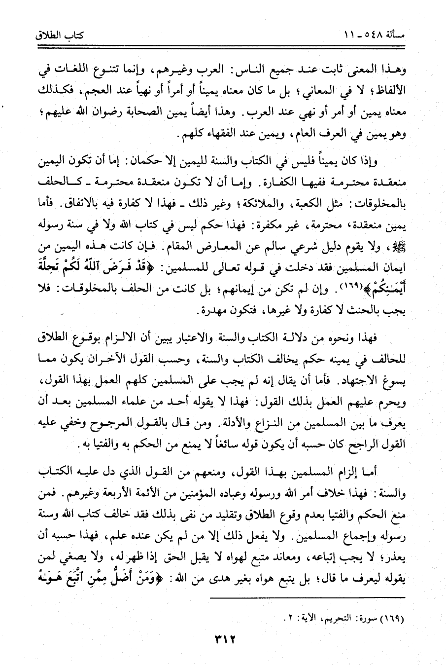 فَهَذَا وَنَحْوُهُ مِنْ دَلَالَةِ الْكِتَابِ وَالسُّنَّةِ وَالِاعْتِبَارُ يُبَيِّنُ أَنَّ الْإِلْزَامَ بِوُقُوعِ الطَّلَاقِ لِلْحَالِفِ مِنْ يَمِينِهِ حُكْمٌ يُخَالِفُ الْكِتَابَ وَالسُّنَّةَ، وَحَسَبُ الْقَوْلِ الْآخَرِ أَنْ يَكُونَ مِمَّا يَسُوغُ الِاجْتِهَادُ. فَأَمَّا أَنْ يُقَالَ: إنَّهُ لَمْ يَجِبْ عَلَى الْمُسْلِمِينَ كُلِّهِمْ الْعَمَلُ بِهَذَا الْقَوْلِ، وَيَحْرُمُ عَلَيْهِمْ الْعَمَلُ بِذَلِكَ الْقَوْلِ: فَهَذَا لَا يَقُولُهُ أَحَدٌ مِنْ عُلَمَاءِ الْمُسْلِمِينَ بَعْدَ أَنْ يَعْرِفَ مَا بَيْنَ الْمُسْلِمِينَ مِنْ النِّزَاعِ وَالْأَدِلَّةِ. وَمَنْ قَالَ بِالْقَوْلِ الْمَرْجُوحِ وَخَفِيَ عَلَيْهِ الْقَوْلُ الرَّاجِحُ كَأَنْ حَسِبَهُ أَنْ يَكُونَ قَوْلُهُ سَائِغًا لَا يُمْنَعُ مِنْ الْحُكْمِ بِهِ وَالْفُتْيَا بِهِ.