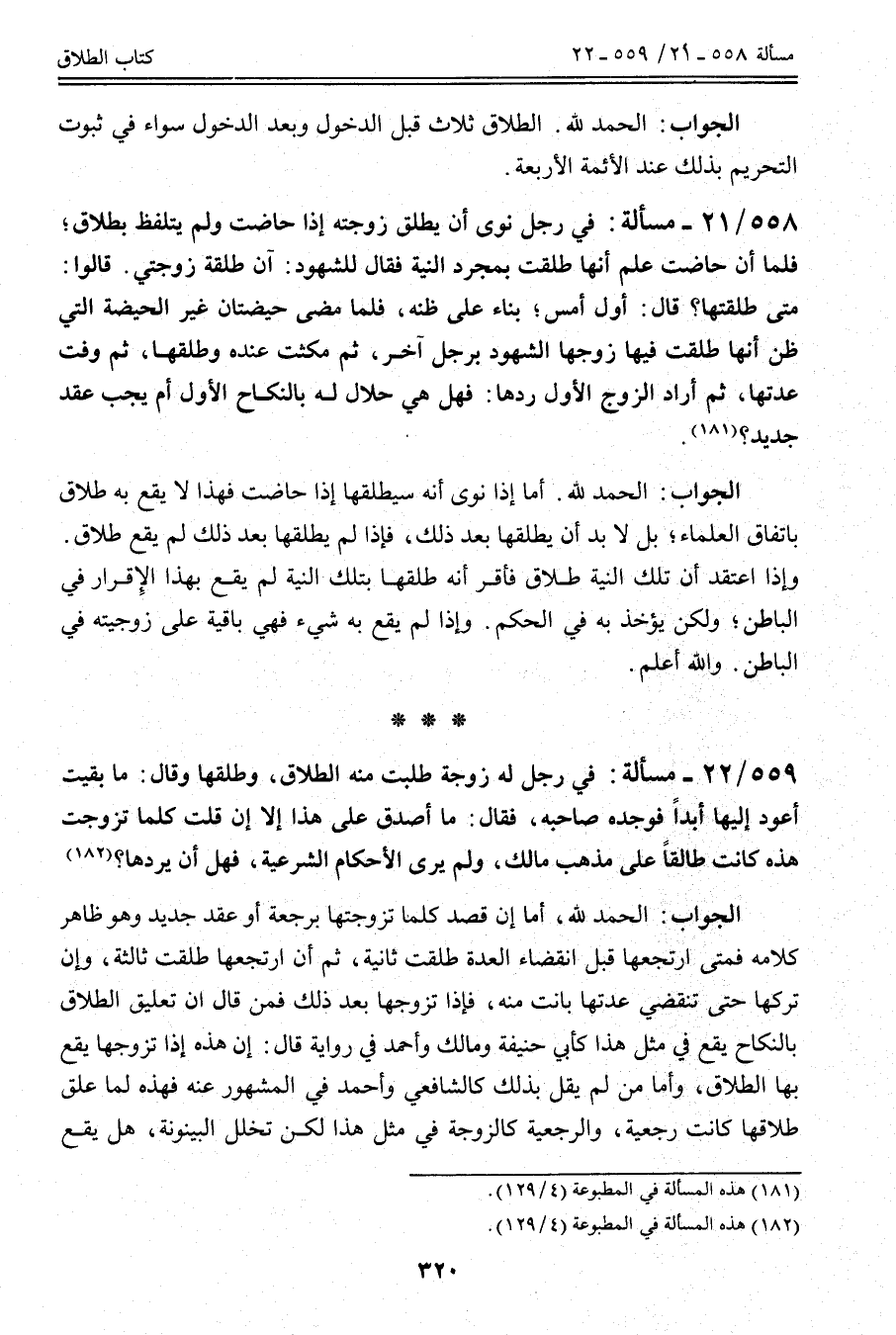 558 - 21 - مَسْأَلَةٌ: فِي رَجُلٍ نَوَى أَنْ يُطَلِّقَ زَوْجَتَهُ إذَا حَاضَتْ وَلَمْ يَتَلَفَّظْ بِطَلَاقٍ؛ فَلَمَّا أَنْ حَاضَتْ عَلِمَ أَنَّهَا طَلُقَتْ بِمُجَرَّدِ النِّيَّةِ فَقَالَ لِلشُّهُودِ: آنَ طَلْقَةُ زَوْجَتِي. قَالُوا: مَتَى طَلَّقْتَهَا؟ قَالَ: أَوَّلَ أَمْسِ؛ بِنَاءً عَلَى ظَنِّهِ، فَلَمَّا مَضَى حَيْضَتَانِ غَيْرُ الْحَيْضَةِ الَّتِي ظَنَّ أَنَّهَا طَلُقَتْ فِيهَا زَوَّجَهَا الشُّهُودُ بِرَجُلٍ آخَرَ، ثُمَّ مَكَثَتْ عِنْدَهُ وَطَلَّقَهَا، ثُمَّ وَفَّتْ عِدَّتَهَا، ثُمَّ أَرَادَ الزَّوْجُ الْأَوَّلُ رَدَّهَا: فَهَلْ هِيَ حَلَالٌ لَهُ بِالنِّكَاحِ الْأَوَّلِ أَمْ يَجِبُ عَقْدٌ جَدِيدٌ؟