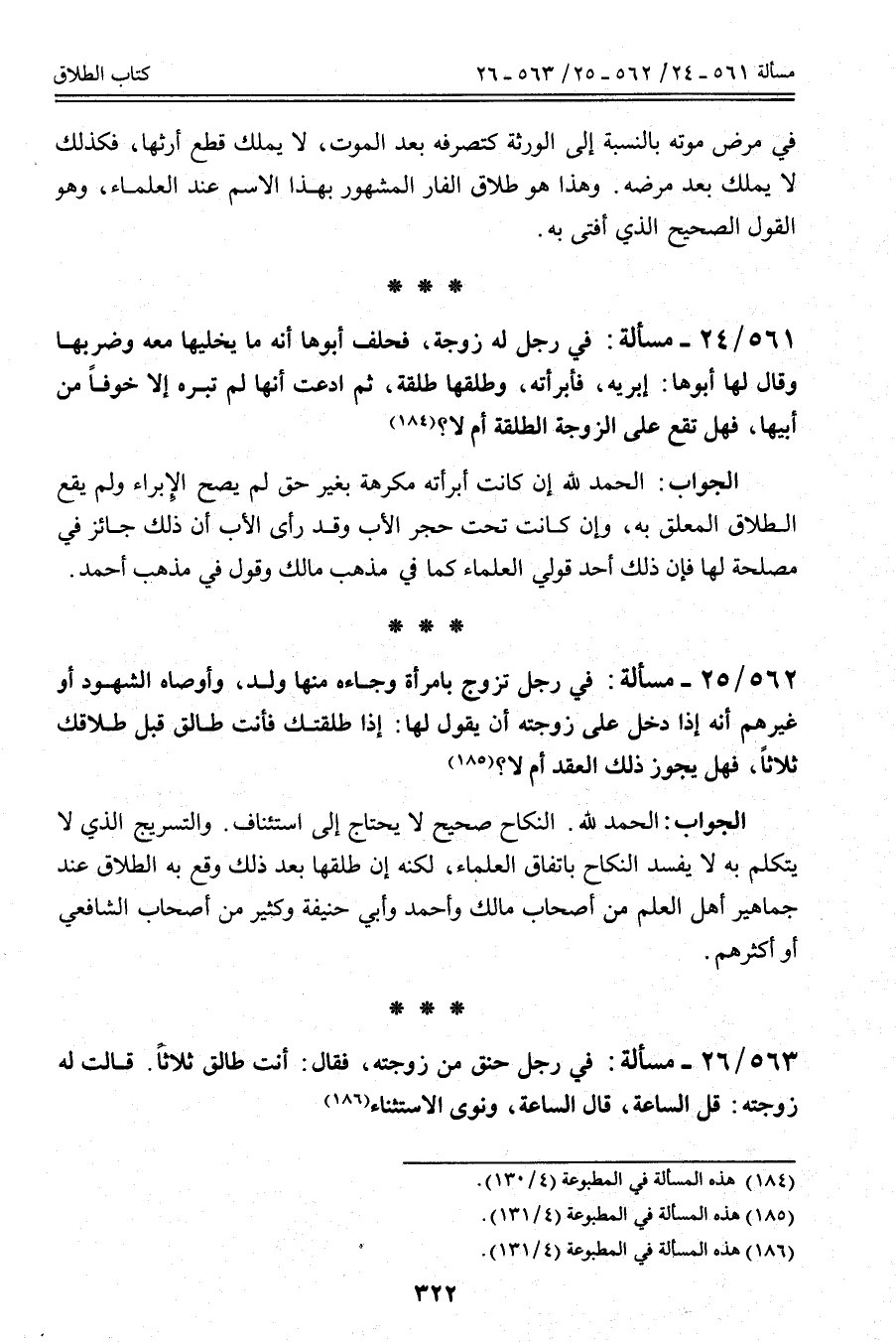 563 - 26 - مَسْأَلَةٌ: فِي رَجُلٍ حُنِقَ مِنْ زَوْجَتِهِ، فَقَالَ: أَنْت طَالِقٌ ثَلَاثًا. قَالَتْ لَهُ زَوْجَتُهُ: قُلْ السَّاعَةَ، قَالَ السَّاعَةَ، وَنَوَى الِاسْتِثْنَاءَ