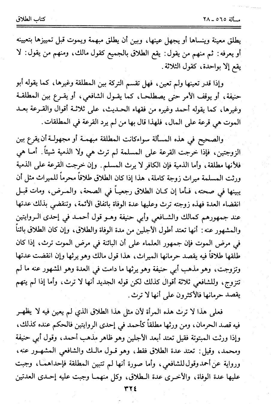 وَالصَّحِيحُ فِي هَذِهِ الْمَسْأَلَةِ سَوَاءٌ كَانَتْ الْمُطَلَّقَةُ مُبْهَمَةً أَوْ مَجْهُولَةً أَنْ يُقْرَعَ بَيْنَ الزَّوْجَتَيْنِ، فَإِذَا خَرَجَتْ الْقُرْعَةُ عَلَى الْمُسْلِمَةِ لَمْ تَرِثْ هِيَ وَلَا الذِّمِّيَّةُ شَيْئًا. أَمَّا هِيَ فَلِأَنَّهَا مُطَلَّقَةٌ، وَأَمَّا الذِّمِّيَّةُ فَإِنَّ الْكَافِرَ لَا يَرِثُ الْمُسْلِمَ. وَإِنْ خَرَجَتْ الْقُرْعَةُ عَلَى الذِّمِّيَّةِ وَرِثَتْ الْمُسْلِمَةُ مِيرَاثَ زَوْجَةٍ كَامِلَةٍ، هَذَا إذَا كَانَ الطَّلَاقُ طَلَاقًا مُحْرِمًا لِلْمِيرَاثِ مِثْلُ أَنْ يُبِينَهَا فِي صِحَّتِهِ، فَأَمَّا إنْ كَانَ الطَّلَاقُ رَجْعِيًّا فِي الصِّحَّةِ، وَالْمَرَضِ، وَمَاتَ قَبْلَ انْقِضَاءِ الْعِدَّةِ فَهَذِهِ زَوْجَتُهُ تَرِثُ وَعَلَيْهَا عِدَّةُ الْوَفَاةِ بِاتِّفَاقِ الْأَئِمَّةِ، وَتَنْقَضِي بِذَلِكَ عِدَّتُهَا عِنْدَ جُمْهُورِهِمْ كَمَالِكٍ وَالشَّافِعِيِّ وَأَبِي حَنِيفَةَ وَهُوَ قَوْلُ أَحْمَدَ فِي إحْدَى الرِّوَايَتَيْنِ وَالْمَشْهُورُ عَنْهُ: أَنَّهَا تَعْتَدُّ أَطْوَلَ الْأَجَلَيْنِ مِنْ مُدَّةِ الْوَفَاةِ وَالطَّلَاقِ، وَإِنْ كَانَ الطَّلَاقُ بَائِنًا فِي مَرَضِ الْمَوْتِ فَإِنَّ جُمْهُورَ الْعُلَمَاءِ عَلَى أَنَّ الْبَائِنَةَ فِي مَرَضِ الْمَوْتِ تَرِثُ، إذَا كَانَ طَلَّقَهَا طَلَاقًا فِيهِ يَقْصِدُ حِرْمَانَهَا الْمِيرَاثَ، هَذَا قَوْلُ مَالِكٍ وَهُوَ يَرِثُهَا وَإِنْ انْقَضَتْ عِدَّتُهَا وَتَزَوَّجَتْ، وَهُوَ مَذْهَبُ أَبِي حَنِيفَةَ وَهُوَ يَرِثُهَا مَا دَامَتْ فِي الْعِدَّةِ وَهُوَ الْمَشْهُورُ عَنْهُ مَا لَمْ تَتَزَوَّجْ، وَلِلشَّافِعِيِّ ثَلَاثَةُ أَقْوَالٍ كَذَلِكَ لَكِنَّ قَوْلَهُ الْجَدِيدَ أَنَّهَا لَا تَرِثُ، وَأَمَّا إذَا لَمْ يُتَّهَمْ بِقَصْدِ حِرْمَانِهَا فَالْأَكْثَرُونَ عَلَى أَنَّهَا لَا تَرِثُ.