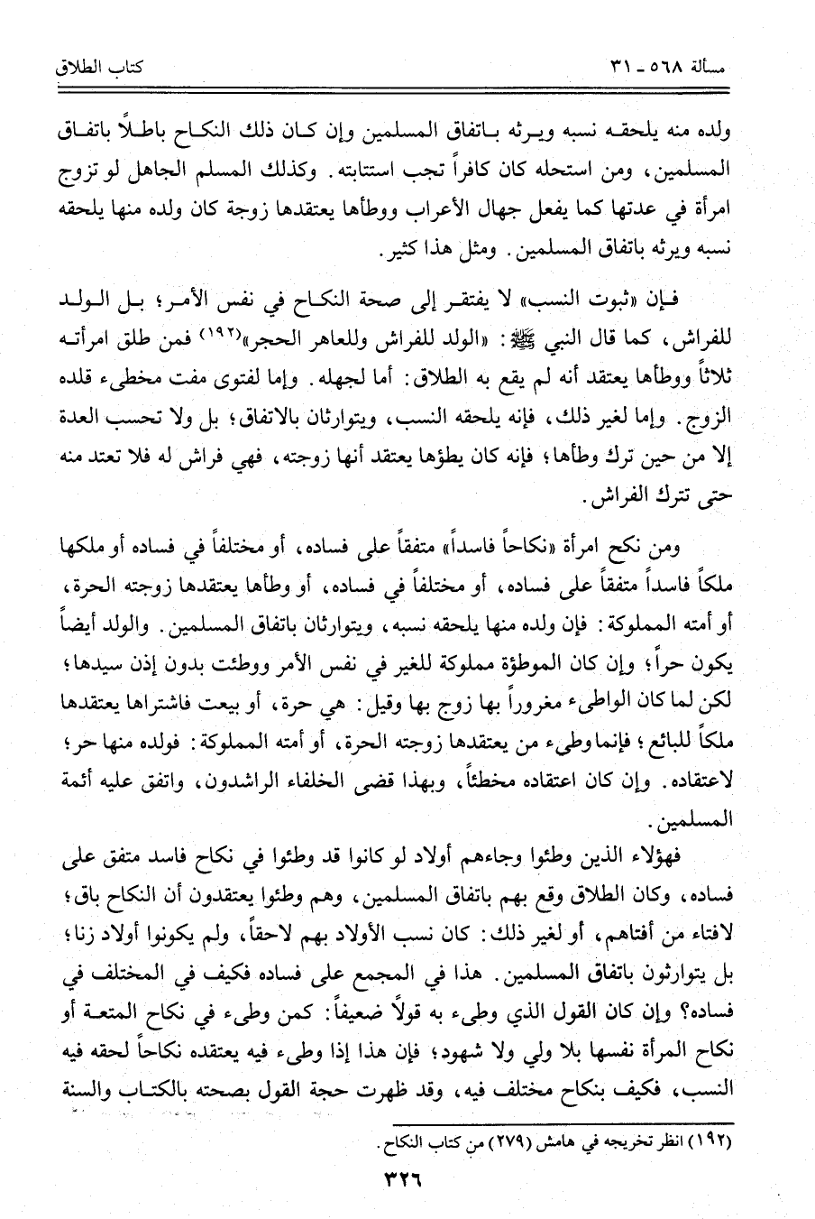فَهَؤُلَاءِ الَّذِينَ وَطِئُوا وَجَاءَهُمْ أَوْلَادٌ لَوْ كَانُوا قَدْ وَطِئُوا فِي نِكَاحٍ فَاسِدٍ مُتَّفَقٍ عَلَى فَسَادِهِ، وَكَانَ الطَّلَاقُ وَقَعَ بِهِمْ بِاتِّفَاقِ الْمُسْلِمِينَ، وَهُمْ وَطِئُوا يَعْتَقِدُونَ أَنَّ النِّكَاحَ بَاقٍ؛ لِإِفْتَاءِ مَنْ أَفْتَاهُمْ، أَوْ لِغَيْرِ ذَلِكَ: كَانَ نَسَبُ الْأَوْلَادِ بِهِمْ لَاحِقًا، وَلَمْ يَكُونُوا أَوْلَادَ زِنًا؛ بَلْ يَتَوَارَثُونَ بِاتِّفَاقِ الْمُسْلِمِينَ. هَذَا فِي الْمُجْمَعِ عَلَى فَسَادِهِ فَكَيْفَ فِي الْمُخْتَلَفِ فِي فَسَادِهِ؟ وَإِنْ كَانَ الْقَوْلُ الَّذِي وَطِئَ بِهِ قَوْلًا ضَعِيفًا: كَمَنْ وَطِئَ فِي نِكَاحِ الْمُتْعَةِ أَوْ نِكَاحِ الْمَرْأَةِ نَفْسَهَا بِلَا وَلِيٍّ وَلَا شُهُودٍ؛ فَإِنَّ هَذَا إذَا وَطِئَ فِيهِ يَعْتَقِدُهُ نِكَاحًا لَحِقَهُ فِيهِ النَّسَبُ، فَكَيْفَ بِنِكَاحٍ مُخْتَلَفٍ فِيهِ، وَقَدْ ظَهَرَتْ حُجَّةُ الْقَوْلِ بِصِحَّتِهِ بِالْكِتَابِ وَالسُّنَّةِ
