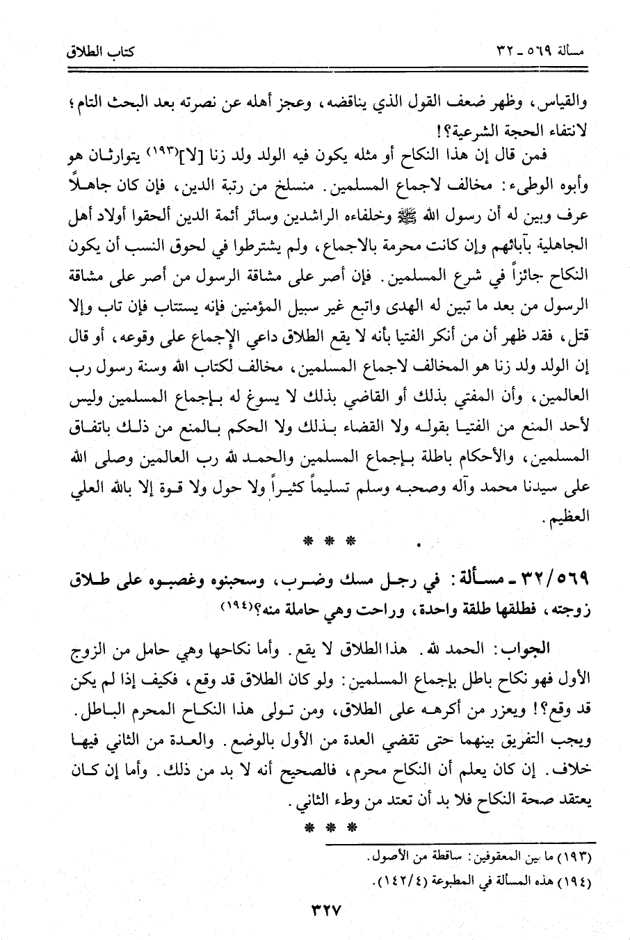 وَالْقِيَاسِ، وَظَهَرَ ضَعْفُ الْقَوْلِ الَّذِي يُنَاقِضُهُ، وَعَجَزَ أَهْلُهُ عَنْ نُصْرَتِهِ بَعْدَ الْبَحْثِ التَّامِّ؛ لِانْتِفَاءِ الْحُجَّةِ الشَّرْعِيَّةِ؟ ، فَمَنْ قَالَ: إنَّ هَذَا النِّكَاحَ أَوْ مِثْلَهُ يَكُونُ فِيهِ الْوَلَدُ وَلَدُ زِنًا [لَا] يَتَوَارَثَانِ هُوَ وَأَبُوهُ الْوَاطِئُ: مُخَالِفٌ لِإِجْمَاعِ الْمُسْلِمِينَ. مُنْسَلِخٌ مِنْ رُتْبَةِ الدِّينِ، فَإِنْ كَانَ جَاهِلًا عُرِّفَ وَبُيِّنَ لَهُ أَنَّ رَسُولَ اللَّهِ - صَلَّى اللَّهُ عَلَيْهِ وَسَلَّمَ - وَخُلَفَاءَهُ الرَّاشِدِينَ وَسَائِرَ أَئِمَّةِ الدِّينِ أَلْحَقُوا أَوْلَادَ أَهْلِ الْجَاهِلِيَّةِ بِآبَائِهِمْ وَإِنْ كَانَتْ مُحَرَّمَةً بِالْإِجْمَاعِ، وَلَمْ يَشْتَرِطُوا فِي لُحُوقِ النَّسَبِ أَنْ يَكُونَ النِّكَاحُ جَائِزًا فِي شَرْعِ الْمُسْلِمِينَ. فَإِنْ أَصَرَّ عَلَى مُشَاقَّةِ الرَّسُولِ مَنْ أَصَرَّ عَلَى مُشَاقَّةِ الرَّسُولِ مِنْ بَعْدِ مَا تَبَيَّنَ لَهُ الْهُدَى وَاتَّبَعَ غَيْرَ سَبِيلِ الْمُؤْمِنِينَ فَإِنَّهُ يُسْتَتَابُ فَإِنْ تَابَ وَإِلَّا قُتِلَ، فَقَدْ ظَهَرَ أَنَّ مَنْ أَنْكَرَ الْفُتْيَا بِأَنَّهُ لَا يَقَعُ الطَّلَاقُ دَاعِيَ الْإِجْمَاعِ عَلَى وُقُوعِهِ، أَوْ قَالَ إنَّ الْوَلَدَ وَلَدُ زِنًا هُوَ الْمُخَالِفُ لِإِجْمَاعِ الْمُسْلِمِينَ، مُخَالِفٌ لِكِتَابِ اللَّهِ وَسُنَّةِ رَسُولِ رَبِّ الْعَالَمِينَ، وَأَنَّ الْمُفْتِيَ بِذَلِكَ أَوْ الْقَاضِيَ بِذَلِكَ لَا يَسُوغُ لَهُ بِإِجْمَاعِ الْمُسْلِمِينَ وَلَيْسَ لِأَحَدٍ الْمَنْعُ مِنْ الْفُتْيَا بِقَوْلِهِ وَلَا الْقَضَاءِ بِذَلِكَ وَلَا الْحُكْمِ بِالْمَنْعِ مِنْ ذَلِكَ بِاتِّفَاقِ الْمُسْلِمِينَ، وَالْأَحْكَامُ بَاطِلَةٌ بِإِجْمَاعِ الْمُسْلِمِينَ وَالْحَمْدُ لِلَّهِ رَبِّ الْعَالَمِينَ وَصَلَّى اللَّهُ عَلَى سَيِّدِنَا مُحَمَّدٍ وَآلِهِ وَصَحْبِهِ وَسَلَّمَ تَسْلِيمًا كَثِيرًا وَلَا حَوْلَ وَلَا قُوَّةَ إلَّا بِاَللَّهِ الْعَلِيِّ الْعَظِيمِ.