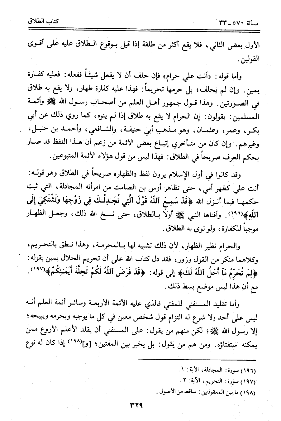 وَأَمَّا قَوْلُهُ: " أَنْتِ عَلَيَّ حَرَامٌ " فَإِنْ حَلَفَ أَنْ لَا يَفْعَلَ شَيْئًا فَفَعَلَهُ: فَعَلَيْهِ كَفَّارَةُ يَمِينٍ. وَإِنْ لَمْ يَحْلِفْ؛ بَلْ حَرَّمَهَا تَحْرِيمًا: فَهَذَا عَلَيْهِ كَفَّارَةُ ظِهَارٍ، وَلَا يَقَعُ بِهِ طَلَاقٌ فِي الصُّورَتَيْنِ. وَهَذَا قَوْلُ جُمْهُورِ أَهْلِ الْعِلْمِ مِنْ أَصْحَابِ رَسُولِ اللَّهِ - صَلَّى اللَّهُ عَلَيْهِ وَسَلَّمَ - وَأَئِمَّةِ الْمُسْلِمِينَ: يَقُولُونَ: إنَّ الْحَرَامَ لَا يَقَعُ بِهِ طَلَاقٌ إذَا لَمْ يَنْوِهِ، كَمَا رُوِيَ ذَلِكَ عَنْ أَبِي بَكْرٍ، وَعُمَرَ، وَعُثْمَانَ، وَهُوَ مَذْهَبُ أَبِي حَنِيفَةَ، وَالشَّافِعِيِّ، وَأَحْمَدَ بْنِ حَنْبَلٍ، وَغَيْرِهِمْ. وَإِنْ كَانَ مِنْ مُتَأَخِّرِي أَتْبَاعِ بَعْضِ الْأَئِمَّةِ مَنْ زَعَمَ أَنَّ هَذَا اللَّفْظَ قَدْ صَارَ بِحُكْمِ الْعُرْفِ صَرِيحًا فِي الطَّلَاقِ: فَهَذَا لَيْسَ مِنْ قَوْلِ هَؤُلَاءِ الْأَئِمَّةِ الْمَتْبُوعِينَ.
