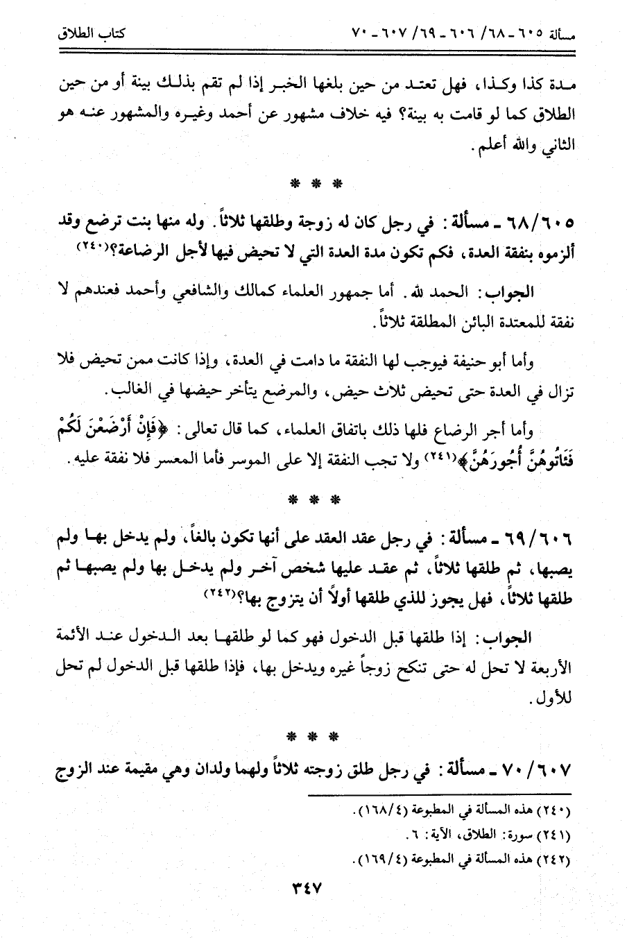 الْجَوَابُ: الْحَمْدُ لِلَّهِ. أَمَّا جُمْهُورُ الْعُلَمَاءِ كَمَالِكٍ وَالشَّافِعِيِّ وَأَحْمَدَ فَعِنْدَهُمْ لَا نَفَقَةَ لِلْمُعْتَدَّةِ الْبَائِنِ الْمُطَلَّقَةِ ثَلَاثًا.