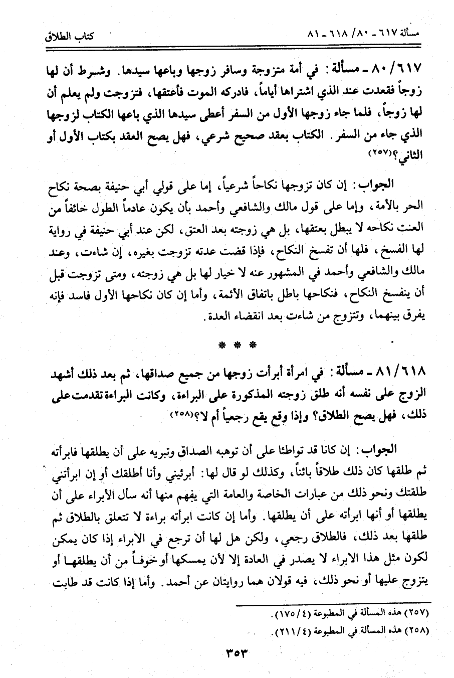 فِي أَمَةٍ مُتَزَوِّجَةٍ وَسَافَرَ زَوْجُهَا وَبَاعَهَا سَيِّدُهَا. وَشَرَطَ أَنَّ لَهَا زَوْجًا فَقَعَدَتْ عِنْدَ الَّذِي اشْتَرَاهَا أَيَّامًا، فَأَدْرَكَهُ الْمَوْتُ فَأَعْتَقَهَا، فَتَزَوَّجَتْ وَلَمْ يَعْلَمْ أَنَّ لَهَا زَوْجًا، فَلَمَّا جَاءَ زَوْجُهَا الْأَوَّلُ مِنْ السَّفَرِ أَعْطَى سَيِّدَهَا الَّذِي بَاعَهَا الْكِتَابَ لِزَوْجِهَا الَّذِي جَاءَ مِنْ السَّفَرِ. الْكِتَابَ بِعَقْدٍ صَحِيحٍ شَرْعِيٍّ، فَهَلْ يَصِحُّ الْعَقْدُ بِكِتَابِ الْأَوَّلِ أَوْ الثَّانِي؟