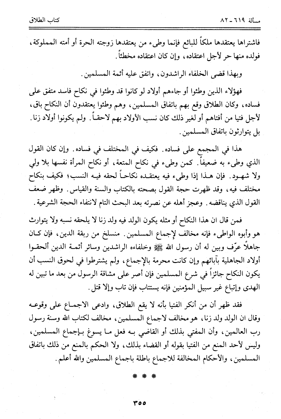 فَهَؤُلَاءِ الَّذِينَ وَطِئُوا أَوْ جَاءَهُمْ أَوْلَادٌ لَوْ كَانُوا قَدْ وَطِئُوا فِي نِكَاحٍ فَاسِدٍ مُتَّفَقٍ عَلَى فَسَادِهِ، وَكَانَ الطَّلَاقُ وَقَعَ بِهِمْ بِاتِّفَاقِ الْمُسْلِمِينَ، وَهُمْ وَطِئُوا يَعْتَقِدُونَ أَنَّ النِّكَاحَ بَاقٍ، لِأَجْلِ فُتْيَا مَنْ أَفْتَاهُمْ أَوْ لِغَيْرِ ذَلِكَ كَانَ نَسَبُ الْأَوْلَادِ بِهِمْ لَاحِقًا. وَلَمْ يَكُونُوا أَوْلَادَ زِنًا. بَلْ يَتَوَارَثُونَ بِاتِّفَاقِ الْمُسْلِمِينَ.
