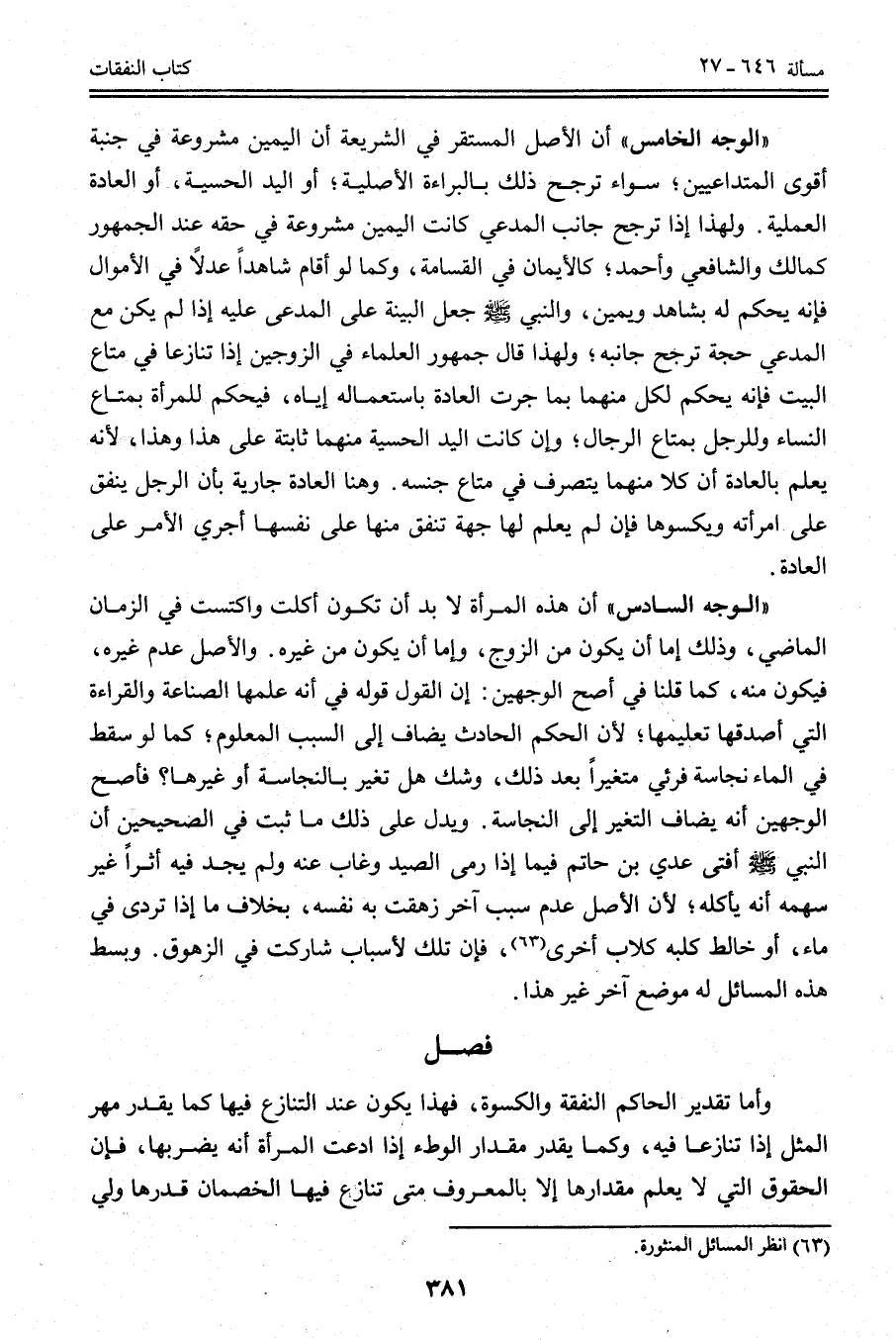 " الْوَجْهُ الْخَامِسُ " أَنَّ الْأَصْلَ الْمُسْتَقَرَّ فِي الشَّرِيعَةِ أَنَّ الْيَمِينَ مَشْرُوعَةٌ فِي جَنَبَةِ أَقْوَى الْمُتَدَاعِيَيْنِ؛ سَوَاءٌ تُرَجِّحُ ذَلِكَ الْبَرَاءَةُ الْأَصْلِيَّةُ؛ أَوْ الْيَدُ الْحِسِّيَّةُ، أَوْ الْعَادَةُ الْعَمَلِيَّةُ. وَلِهَذَا إذَا تَرَجَّحَ جَانِبُ الْمُدَّعِي كَانَتْ الْيَمِينُ مَشْرُوعَةً فِي حَقِّهِ عِنْدَ الْجُمْهُورِ كَمَالِكٍ وَالشَّافِعِيِّ وَأَحْمَدَ؛ كَالْأَيْمَانِ فِي الْقَسَامَةِ، وَكَمَا لَوْ أَقَامَ شَاهِدًا عَدْلًا فِي الْأَمْوَالِ فَإِنَّهُ يُحْكَمُ لَهُ بِشَاهِدٍ وَيَمِينٍ، وَالنَّبِيُّ - صَلَّى اللَّهُ عَلَيْهِ وَسَلَّمَ - جَعَلَ الْبَيِّنَةَ عَلَى الْمُدَّعَى عَلَيْهِ إذَا لَمْ يَكُنْ مَعَ الْمُدَّعِي حُجَّةٌ تُرَجِّحُ جَانِبَهُ؛ وَلِهَذَا قَالَ جُمْهُورُ الْعُلَمَاءِ فِي الزَّوْجَيْنِ إذَا تَنَازَعَا فِي مَتَاعِ الْبَيْتِ فَإِنَّهُ يُحْكَمُ لِكُلٍّ مِنْهُمَا بِمَا جَرَتْ الْعَادَةُ بِاسْتِعْمَالِهِ إيَّاهُ، فَيُحْكَمُ لِلْمَرْأَةِ بِمَتَاعِ النِّسَاءِ وَلِلرَّجُلِ بِمَتَاعِ الرِّجَالِ؛ وَإِنْ كَانَتْ الْيَدُ الْحِسِّيَّةُ مِنْهُمَا ثَابِتَةً عَلَى هَذَا وَهَذَا، لِأَنَّهُ يُعْلَمُ بِالْعَادَةِ أَنَّ كُلًّا مِنْهُمَا يَتَصَرَّفُ فِي مَتَاعِ جِنْسِهِ. وَهُنَا الْعَادَةُ جَارِيَةٌ بِأَنَّ الرَّجُلَ يُنْفِقُ عَلَى امْرَأَتِهِ وَيَكْسُوهَا فَإِنْ لَمْ يُعْلَمْ لَهَا جِهَةٌ تُنْفِقُ مِنْهَا عَلَى نَفْسِهَا أُجْرِيَ الْأَمْرُ عَلَى الْعَادَةِ.