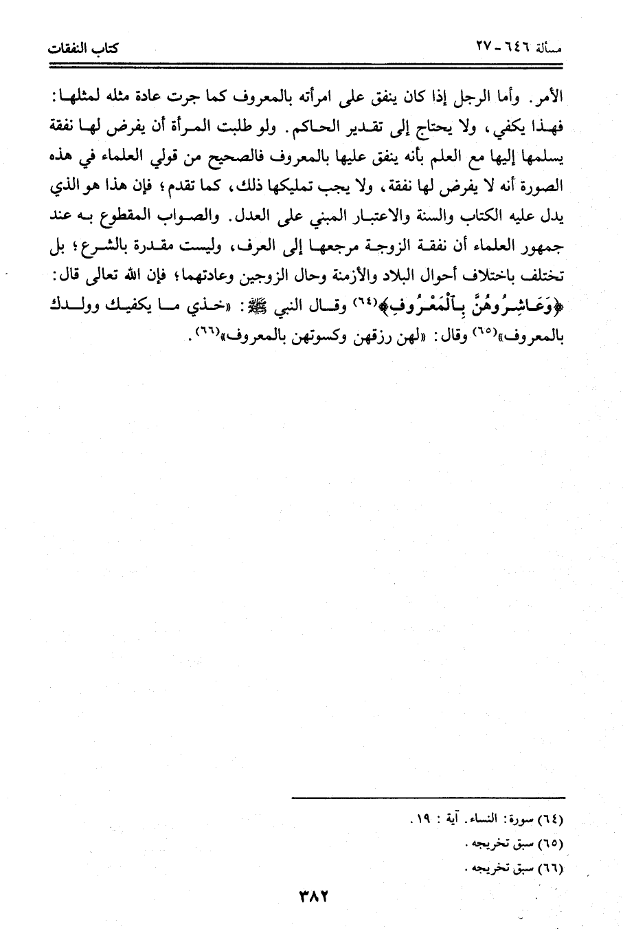 الْأَمْرِ وَأَمَّا الرَّجُلُ إذَا كَانَ يُنْفِقُ عَلَى امْرَأَتِهِ بِالْمَعْرُوفِ كَمَا جَرَتْ عَادَةُ مِثْلِهِ لِمِثْلِهَا: فَهَذَا يَكْفِي، وَلَا يَحْتَاجُ إلَى تَقْدِيرِ الْحَاكِمِ. وَلَوْ طَلَبَتْ الْمَرْأَةُ أَنْ يَفْرِضَ لَهَا نَفَقَةً يُسَلِّمُهَا إلَيْهَا مَعَ الْعِلْمِ بِأَنَّهُ يُنْفِقُ عَلَيْهَا بِالْمَعْرُوفِ فَالصَّحِيحُ مِنْ قَوْلَيْ الْعُلَمَاءِ فِي هَذِهِ الصُّورَةِ أَنَّهُ لَا يُفْرَضُ لَهَا نَفَقَةٌ، وَلَا يَجِبُ تَمْلِيكُهَا ذَلِكَ، كَمَا تَقَدَّمَ؛ فَإِنَّ هَذَا هُوَ الَّذِي يَدُلُّ عَلَيْهِ الْكِتَابُ وَالسُّنَّةُ وَالِاعْتِبَارُ الْمَبْنِيُّ عَلَى الْعَدْلِ. وَالصَّوَابُ الْمَقْطُوعُ بِهِ عِنْدَ جُمْهُورِ الْعُلَمَاءِ أَنَّ نَفَقَةَ الزَّوْجَةِ مَرْجِعُهَا إلَى الْعُرْفِ، وَلَيْسَتْ مُقَدَّرَةً بِالشَّرْعِ؛ بَلْ تَخْتَلِفُ بِاخْتِلَافِ أَحْوَالِ الْبِلَادِ وَالْأَزْمِنَةِ وَحَالُ الزَّوْجَيْنِ وَعَادَتُهُمَا؛ فَإِنَّ اللَّهَ تَعَالَى قَالَ: {وَعَاشِرُوهُنَّ بِالْمَعْرُوفِ} [النساء: 19] وَقَالَ النَّبِيُّ - صَلَّى اللَّهُ عَلَيْهِ وَسَلَّمَ -: «خُذِي مَا يَكْفِيكِ وَوَلَدَكِ بِالْمَعْرُوفِ» وَقَالَ: «لَهُنَّ رِزْقُهُنَّ وَكِسْوَتُهُنَّ بِالْمَعْرُوفِ» .