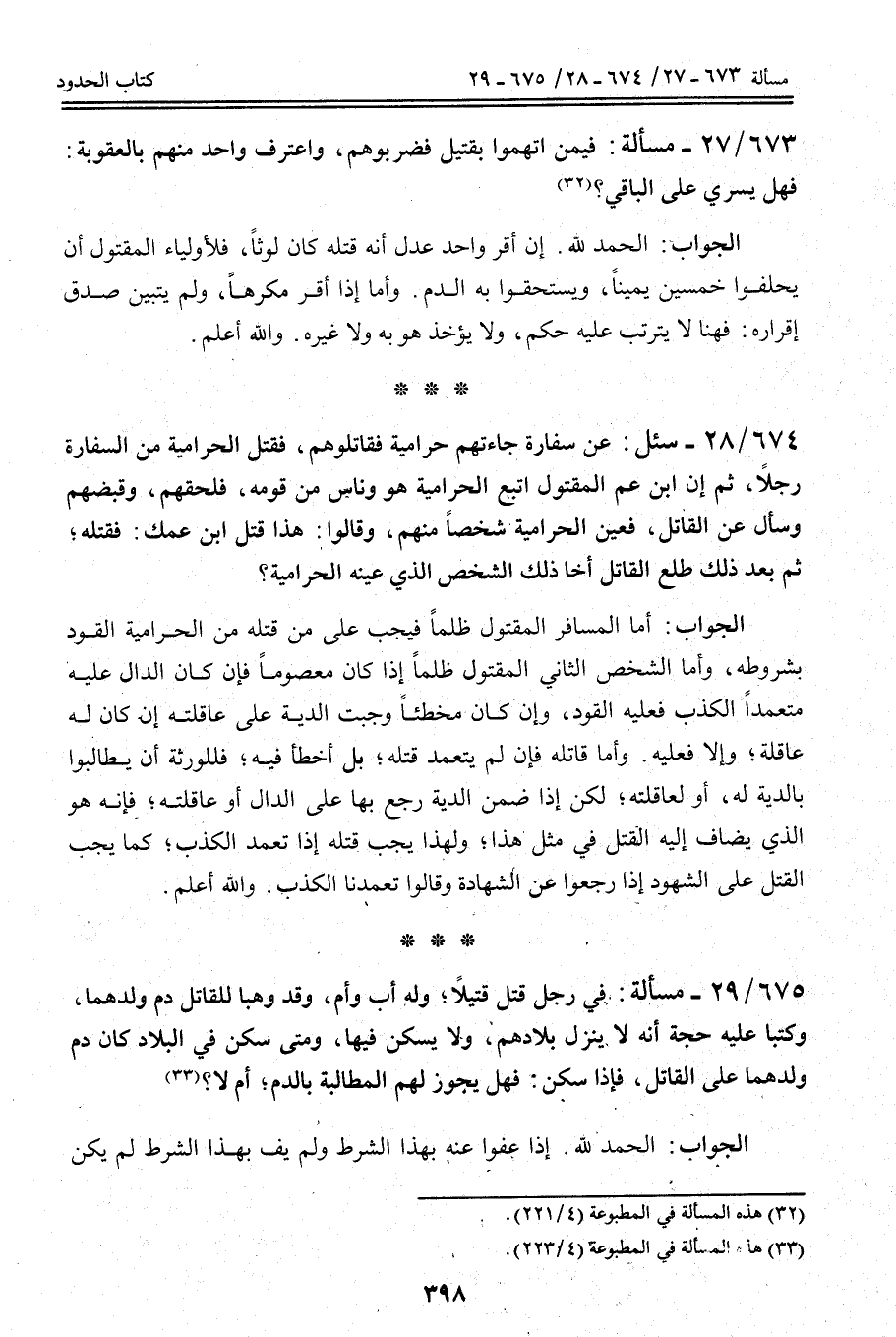 674 - 28 - سُئِلَ عَنْ سِفَارَةٍ جَاءَتْهُمْ حَرَامِيَّةٌ فَقَاتَلُوهُمْ، فَقَتَلَ الْحَرَامِيَّةُ مِنْ السِّفَارَةِ رَجُلًا، ثُمَّ إنَّ ابْنَ عَمِّ الْمَقْتُولِ اتَّبَعَ الْحَرَامِيَّةَ هُوَ وَنَاسٌ مِنْ قَوْمِهِ، فَلَحِقَهُمْ، وَقَبَضَهُمْ وَسَأَلَ عَنْ الْقَاتِلِ، فَعَيَّنَ الْحَرَامِيَّةُ شَخْصًا مِنْهُمْ، وَقَالُوا: هَذَا قَتَلَ ابْنَ عَمِّك: فَقَتَلَهُ؛ ثُمَّ بَعْدَ ذَلِكَ طَلَعَ الْقَاتِلُ أَخَا ذَلِكَ الشَّخْصِ الَّذِي عَيَّنَهُ الْحَرَامِيَّةُ؟