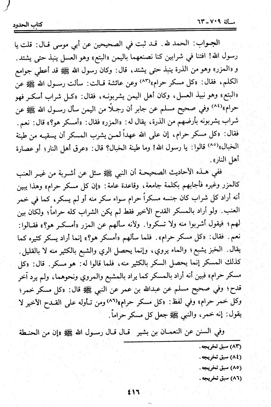 فَفِي هَذِهِ الْأَحَادِيثِ الصَّحِيحَةِ أَنَّ النَّبِيَّ - صَلَّى اللَّهُ عَلَيْهِ وَسَلَّمَ - سُئِلَ عَنْ أَشْرِبَةٍ مِنْ غَيْرِ الْعِنَبِ كَالْمِزْرِ وَغَيْرِهِ فَأَجَابَهُمْ بِكَلِمَةٍ جَامِعَةٍ، وَقَاعِدَةٍ عَامَّةٍ: «إنَّ كُلَّ مُسْكِرٍ حَرَامٌ» وَهَذَا يُبَيِّنُ أَنَّهُ أَرَادَ كُلَّ شَرَابٍ كَانَ جِنْسُهُ مُسْكِرًا حَرَامٌ سَوَاءٌ سَكِرَ مِنْهُ أَوْ لَمْ يَسْكَرْ، كَمَا فِي خَمْرِ الْعِنَبِ. وَلَوْ أَرَادَ بِالْمُسْكِرِ الْقَدَحَ الْأَخِيرَ فَقَطْ لَمْ يَكُنْ الشَّرَابُ كُلُّهُ حَرَامًا؛ وَلَكَانَ بَيَّنَ لَهُمْ؛ فَيَقُولُ اشْرَبُوا مِنْهُ وَلَا تَسْكَرُوا. وَلِأَنَّهُ «سَأَلَهُمْ عَنْ الْمِزْرِ أَمُسْكِرٌ هُوَ؟ فَقَالُوا: نَعَمْ. فَقَالَ: كُلُّ مُسْكِرٍ حَرَامٌ» . فَلَمَّا سَأَلَهُمْ " أَمُسْكِرٌ هُوَ؟ " إنَّمَا أَرَادَ يُسْكِرُ كَثِيرُهُ كَمَا يُقَالُ الْخُبْزُ يُشْبِعُ؛ وَالْمَاءُ يُرْوِي، وَإِنَّمَا يَحْصُلُ الرِّيُّ وَالشِّبَعُ بِالْكَثِيرِ مِنْهُ لَا بِالْقَلِيلِ.
