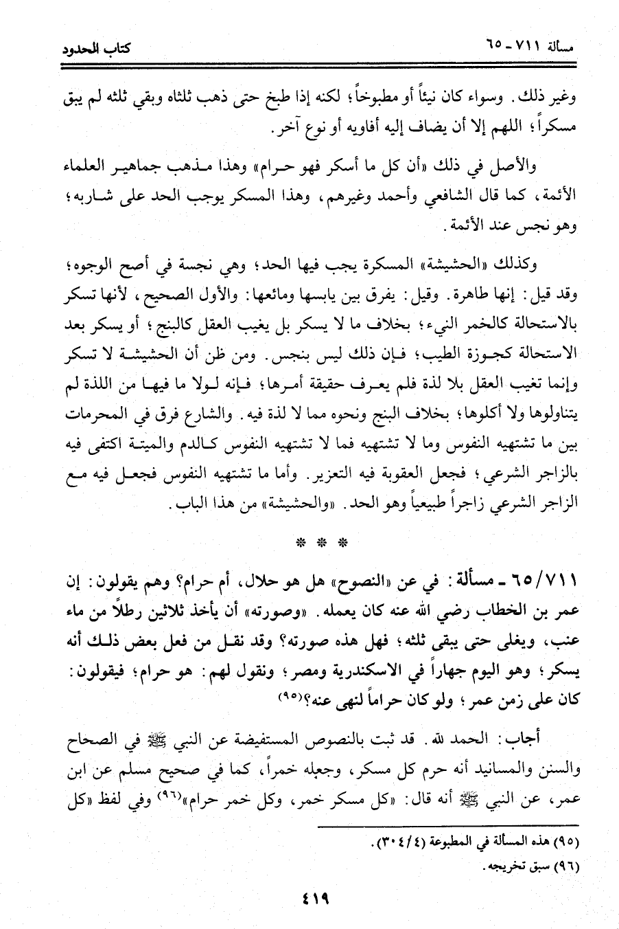فِي " النَّصُوحِ " هَلْ هُوَ حَلَالٌ، أَمْ حَرَامٌ؟ وَهُمْ يَقُولُونَ: إنَّ عُمَرَ بْنَ الْخَطَّابِ - رَضِيَ اللَّهُ عَنْهُ - كَانَ يَعْمَلُهُ. " وَصُورَتُهُ " أَنْ يَأْخُذَ ثَلَاثِينَ رِطْلًا مِنْ مَاءِ عِنَبٍ، وَيُغْلَى حَتَّى يَبْقَى ثُلُثُهُ؛ فَهَلْ هَذِهِ صُورَتُهُ؟ وَقَدْ نَقَلَ مَنْ فَعَلَ بَعْضَ ذَلِكَ أَنَّهُ يُسْكِرُ؛ وَهُوَ الْيَوْمَ جِهَارًا فِي الْإِسْكَنْدَرِيَّة وَمِصْرَ؛ وَنَقُولُ لَهُمْ: هُوَ حَرَامٌ؛ فَيَقُولُونَ: كَانَ عَلَى زَمَنِ عُمَرَ؛ وَلَوْ كَانَ حَرَامًا لَنَهَى عَنْهُ؟
