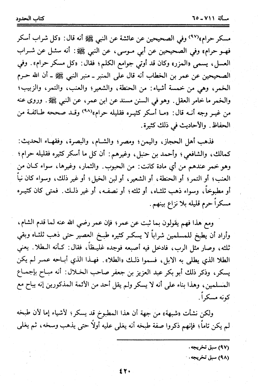 فَذَهَبَ أَهْلُ الْحِجَازِ، وَالْيَمَنِ؛ وَمِصْرَ؛ وَالشَّامِ، وَالْبَصْرَةِ، وَفُقَهَاءُ الْحَدِيثِ: كَمَالِكٍ، وَالشَّافِعِيِّ؛ وَأَحْمَدَ بْنِ حَنْبَلٍ، وَغَيْرِهِمْ: أَنَّ كُلَّ مَا أَسْكَرَ كَثِيرُهُ فَقَلِيلُهُ حَرَامٌ؛ وَهُوَ خَمْرٌ عِنْدَهُمْ مِنْ أَيِّ مَادَّةٍ كَانَتْ: مِنْ الْحُبُوبِ. وَالثِّمَارِ، وَغَيْرِهَا، سَوَاءٌ كَانَ مِنْ الْعِنَبِ؛ أَوْ التَّمْرِ؛ أَوْ الْحِنْطَةِ، أَوْ الشَّعِيرِ، أَوْ لَبَنِ الْخَيْلِ؛ أَوْ غَيْرِ ذَلِكَ، وَسَوَاءٌ كَانَ نِيًّا أَوْ مَطْبُوخًا، وَسَوَاءٌ ذَهَبَ ثُلُثَاهُ، أَوْ ثُلُثُهُ؛ أَوْ نِصْفُهُ، أَوْ غَيْرُ ذَلِكَ. فَمَتَى كَانَ كَثِيرُهُ مُسْكِرًا حَرُمَ قَلِيلُهُ بِلَا نِزَاعٍ بَيْنَهُمْ.